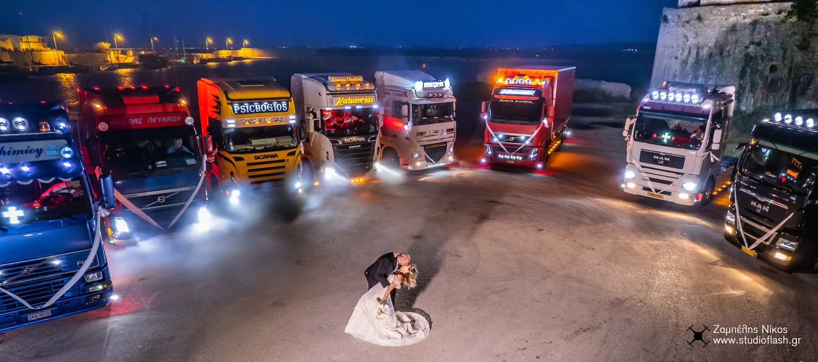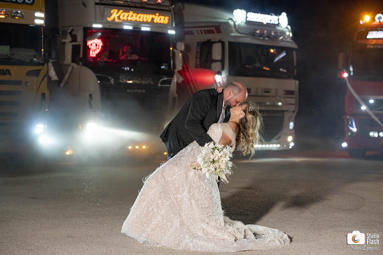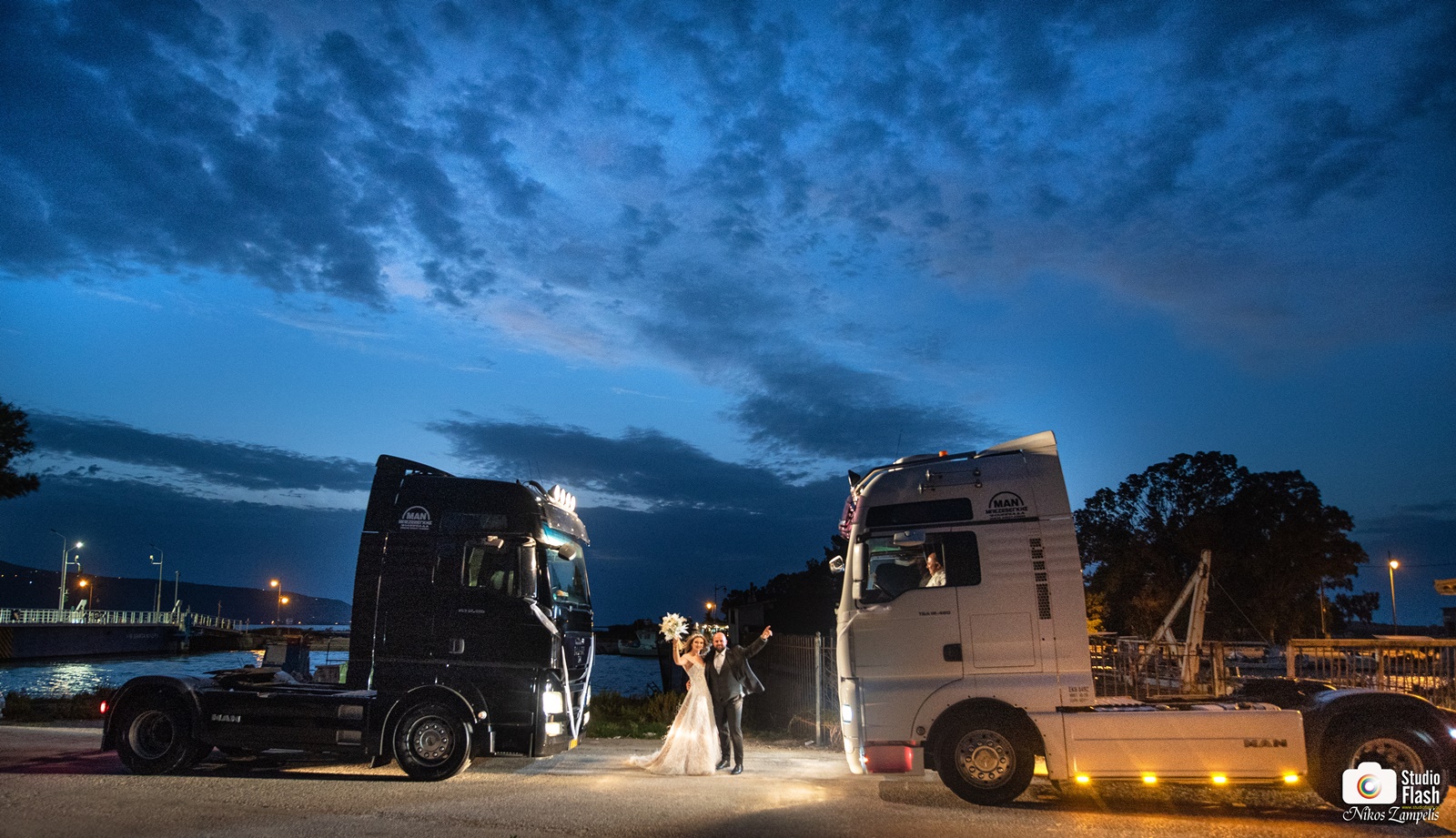 Αξιοσημείωτο ήταν ότι ο γαμπρός, ο οποίος διατηρεί μεταφορική εταιρεία, έφτασε στην εκκλησία με το φορτηγό του συνοδευόμενος και από άλλους συναδέλφους του οδηγούς.