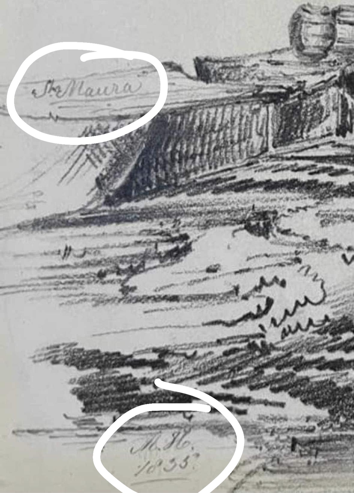 Το αξιοπερίεργο είναι ότι το έργο δεν είναι γκραβούρα αλλά ζωγραφισμένο με μολύβι και είναι μοναδικό καθώς δεν υπάρχει αντίγραφο. Υπογράφεται στο κάτω αριστερό άκρο με τα αρχικά Μ.Η. και φέρει την χρονολογία 1835. Είναι από την αξιοθαύμαστη συλλογή γκραβουρών, χαρτών, μεταλλίων κλπ. του κ. Δημητρίου Γιαννουλάτου τον οποίο και ευχαριστούμε για την παραχώρηση της φωτογραφίας. Στις προθέσεις του συλλέκτη είναι να εκτεθούν κάποια φορά δημόσια τα αντικείμενα της συλλογής του.
