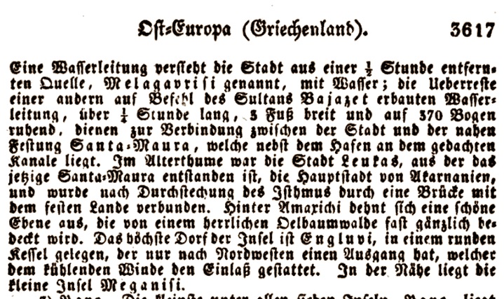 Για το νησί της Λευκάδας και το Οθωμανικό Υδραγωγείο αναφέρει ο W. Hoffmann στο βιβλίο του «Beschreibung der Erde nach ihrer natürlichen Beschaffenheit, ihren Erzeugnissen, Bewohnern und deren Wirkungen und Verhältnissen wie sie jetzt sind: ein Hand- und Lesebuch für alle Stände. Europa: Ungarn, Türkei, Griechenland» που εκδόθηκε το 1842 – Η μετάφραση είναι δική μας:
