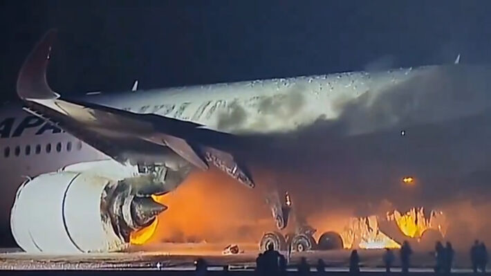 Aεροσκάφος της εταιρείας Japan Airlines πήρε φωτιά στον διάδρομο προσγείωσης-απογείωσης του αεροδρομίου του Τόκιο, του Χανέντα, μετά από σύγκρουση με αεροσκάφος της Ακτοφυλακής, μετέδωσε το τηλεοπτικό δίκτυο Nippon TV.