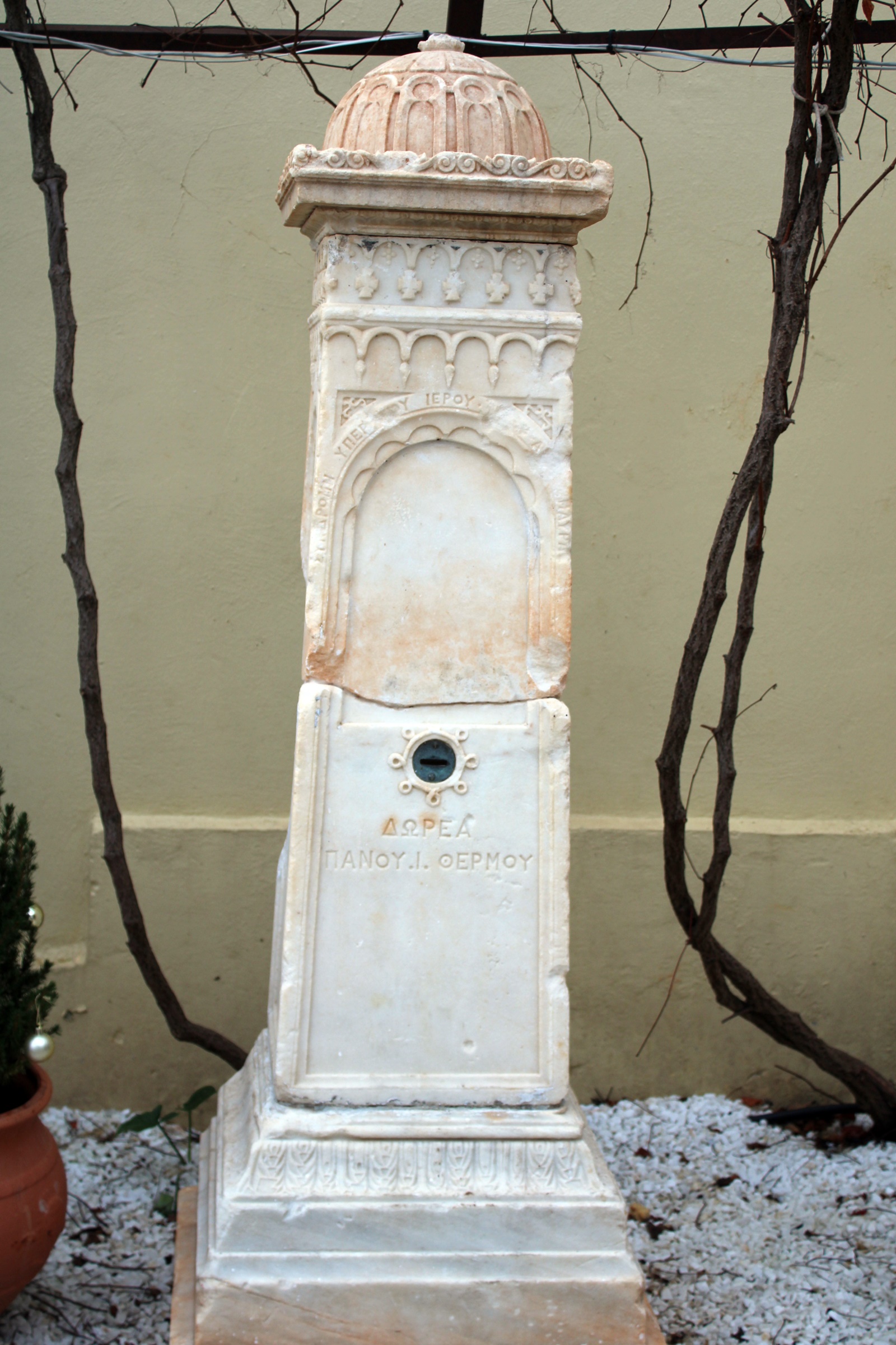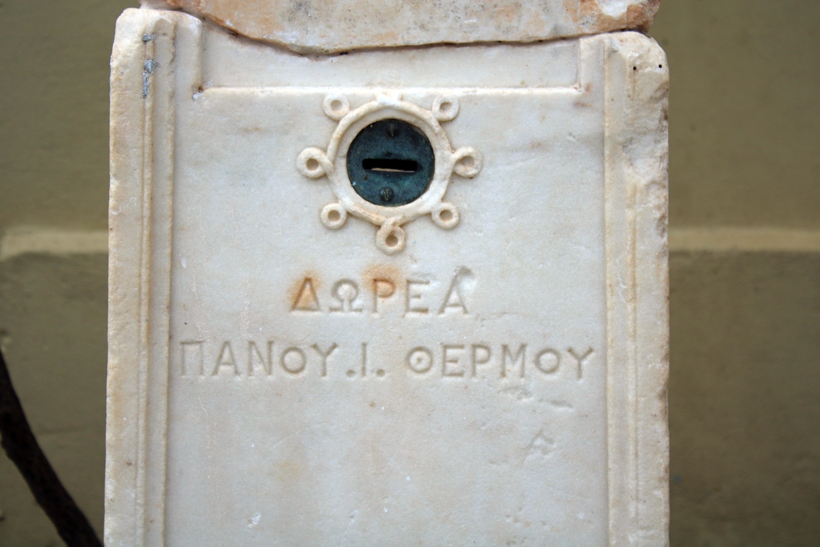 Κάτω ακριβώς από τη σχισμή για τα χρήματα αναγράφεται το ονοματεπώνυμο του δωρητή που είχε αναλάβει τα έξοδα κατασκευής: «ΔΩΡΕΑ ΠΑΝΟΥ Ι. ΘΕΡΜΟΥ». Πρόκειται για τον γνωστό Λευκαδίτη έμπορο ο οποίος πέθανε στις 25 Σεπτεμβρίου 1917 σε ηλικία 65 ετών. Οπότε συμπεραίνουμε, ότι το προσκυνητάρι-παγκάρι που αποτελεί ένα δείγμα της εκκλησιαστικής τέχνης και συνάμα ιστορικό-λαογραφικό στοιχείο του τόπου μας, είναι άνω των 100 ετών.