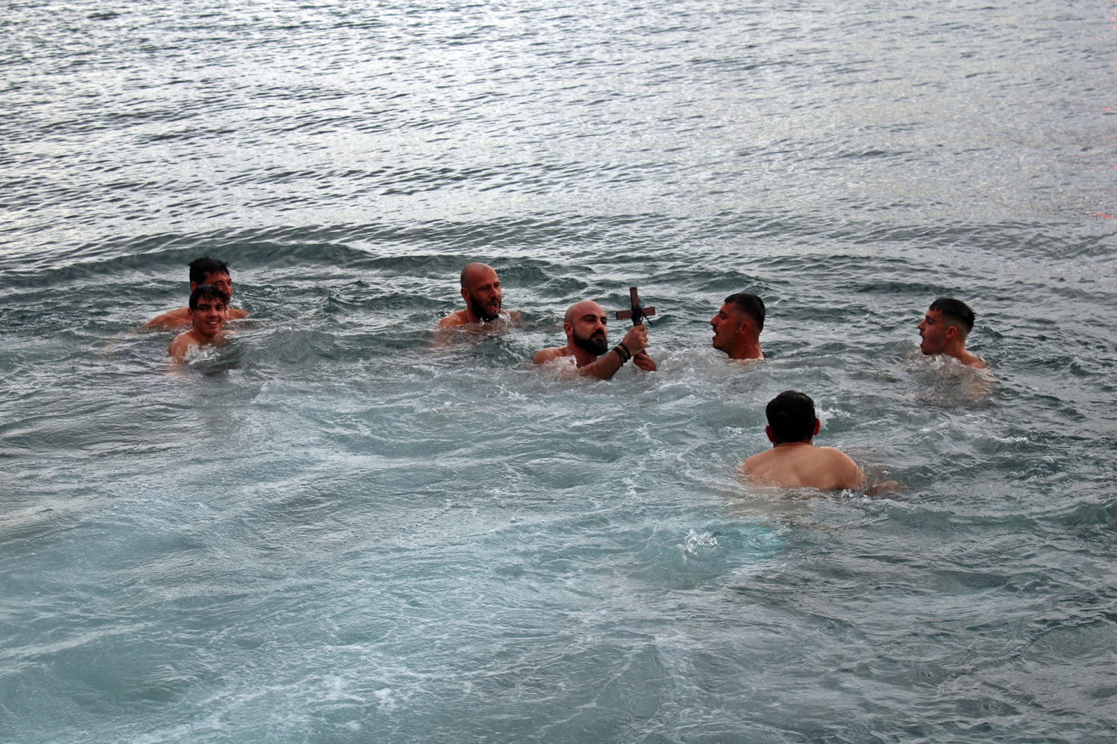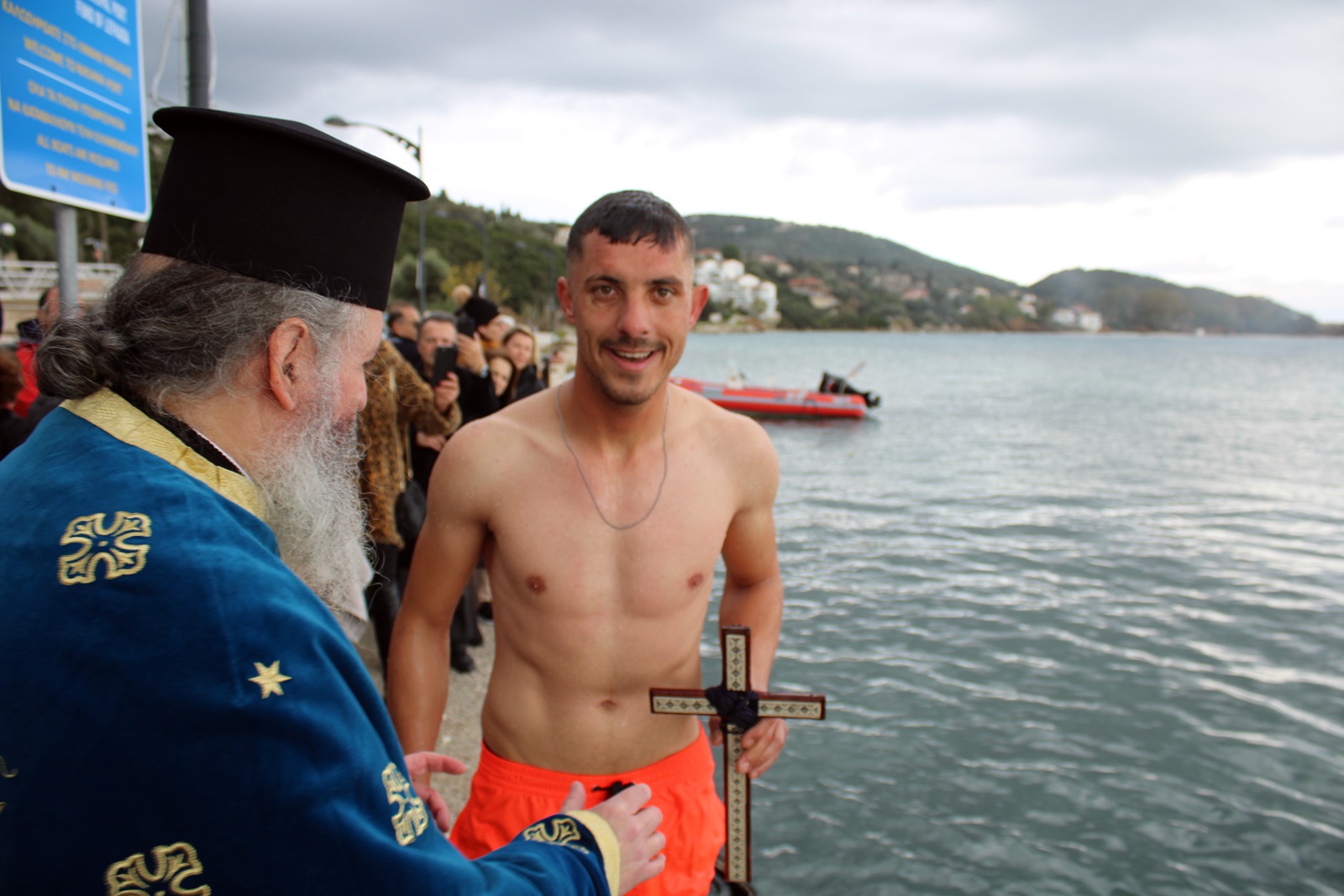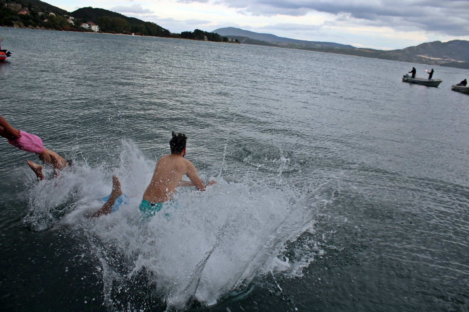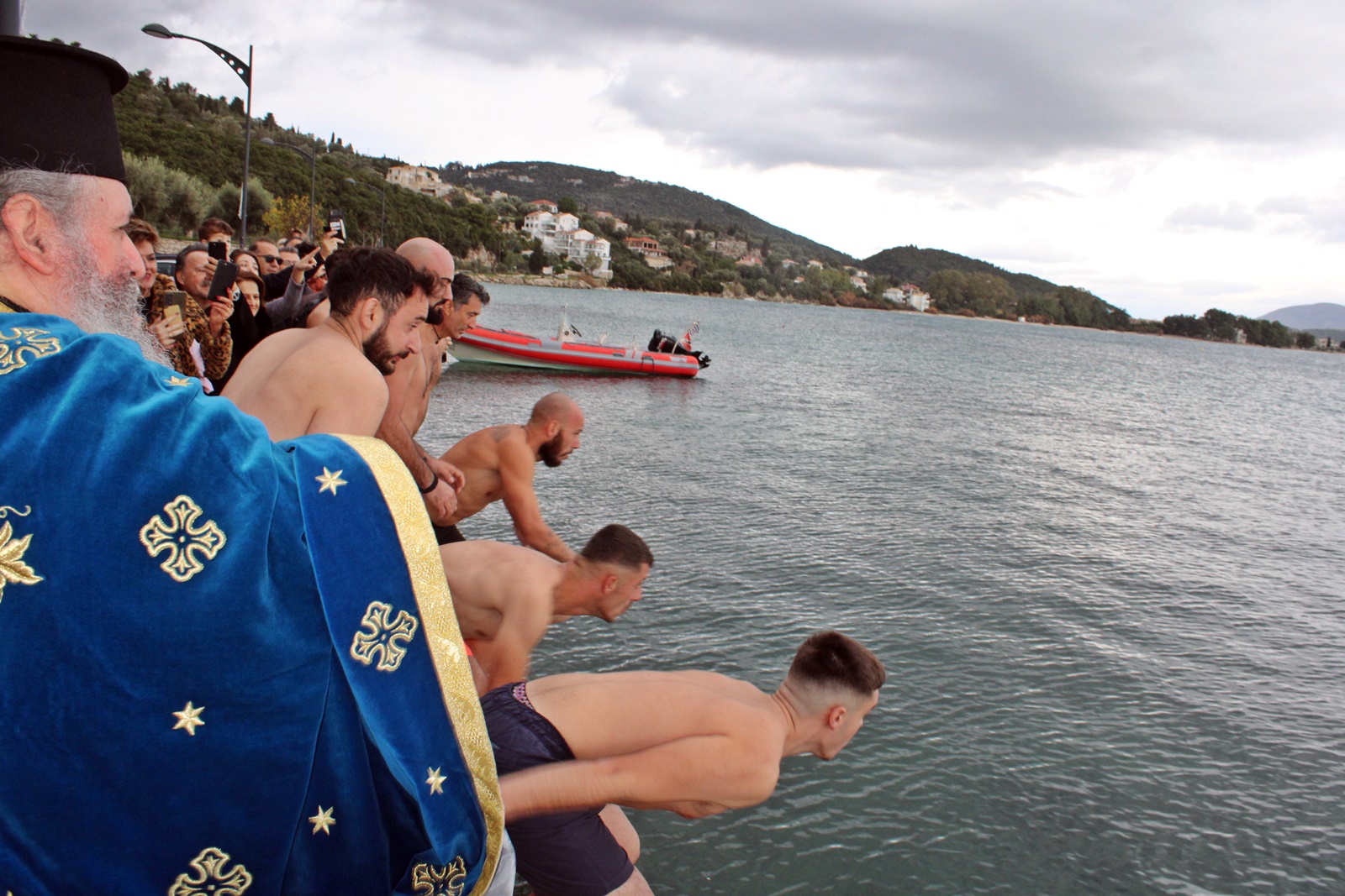 Έξι ήταν φέτος οι τολμηροί που βούτηξαν για να πιάσουν τον σταυρό μετά το τρίτο «Εν Ιορδάνη βαπτιζομένου σου Κύριε…», με τον συνήθη ύποπτο Δημήτρη Μανωλίτση να τον πιάνει και πάλι φέτος πρώτος.