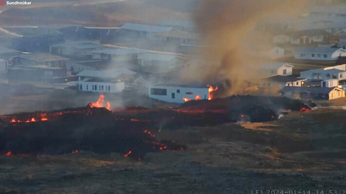 Η λάβα από την ηφαιστειακή έκρηξη, που βρίσκεται σε εξέλιξη στη νοτιοδυτική Ισλανδία, έφθασε σήμερα στο λιμάνι Γκρίνταβικ, όπου δύο σπίτια έπιασαν φωτιά, σύμφωνα με εικόνες που μεταδόθηκαν από τη δημόσια τηλεόραση.