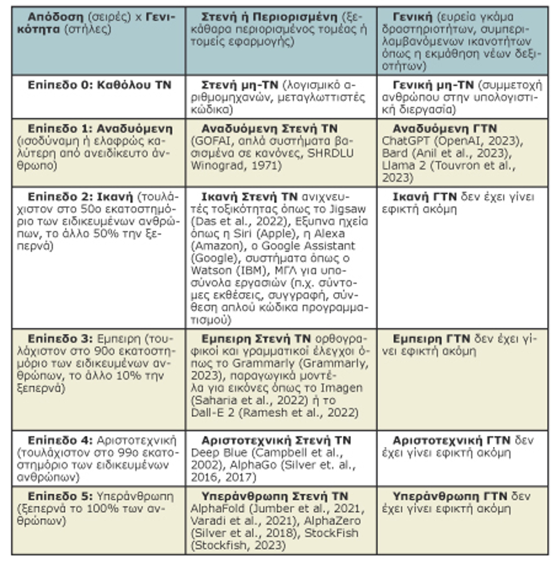 Κατάταξη των ειδών Τεχνητής Νοημοσύνης σε έξι επίπεδα από την DeepMind, μαζί με ορισμένα από τα σχετικά ορόσημα