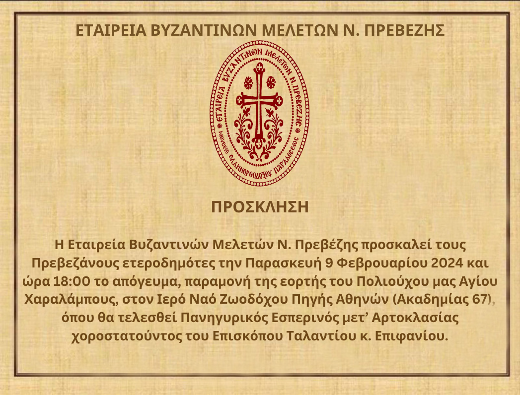 Η Εταιρεία Βυζαντινών Μελετών Ν. Πρεβέζης προσκαλεί τους Πρεβεζάνους ετεροδημότες την Παρασκευή 9 Φεβρουαρίου 2024 και ώρα 18:00 το απόγευμα, παραμονή της εορτής του Πολιούχου μας Αγίου Χαραλάμπους, στον Ιερό Ναό Ζωοδόχου Πηγής Αθηνών (Ακαδημίας 67), όπου θα τελεσθεί Πανηγυρικός Εσπερινός μετ’ Αρτοκλασίας χοροστατούντος του Επισκόπου Ταλαντίου κ.