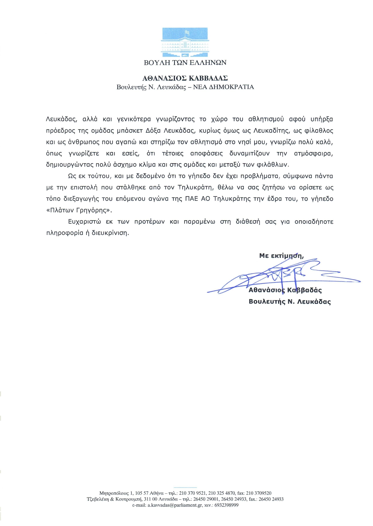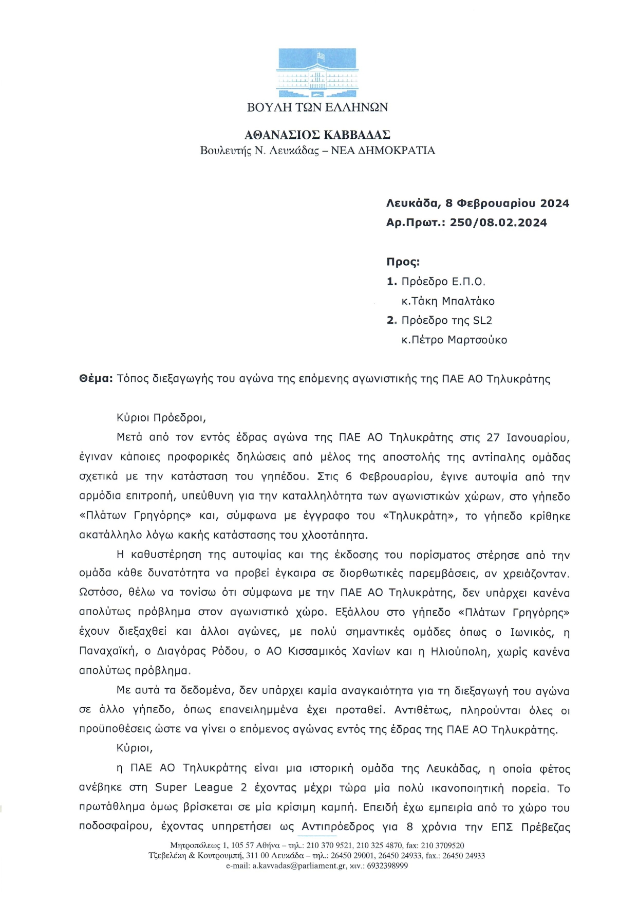 Με επιστολή του προς τους προέδρους της ΕΠΟ και της Super League 2, ο βουλευτής Ν. Λευκάδας, Θανάσης Καββαδάς, ζητά τη διεξαγωγή του επόμενου εντός έδρας αγώνα του Τηλυκράτη στο γήπεδό του «Πλάτων Γρηγόρης».