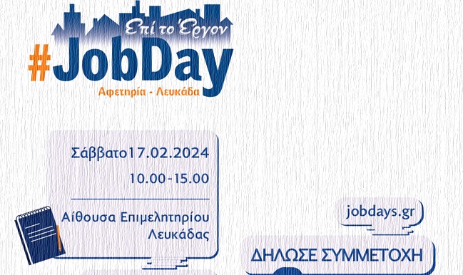 Το #JobDay Αφετηρία – Λευκάδα απευθύνεται σε όποιον αναζητά εργασία ή σκέφτεται να αλλάξει επάγγελμα και θέλει να διευρύνει τις γνώσεις και τις δεξιότητές του δημιουργώντας ένα καλύτερο βιογραφικό και λαμβάνοντας όλες εκείνες τις πληροφορίες που θα τον βοηθήσουν να γίνει περιζήτητος στην αγορά εργασίας.