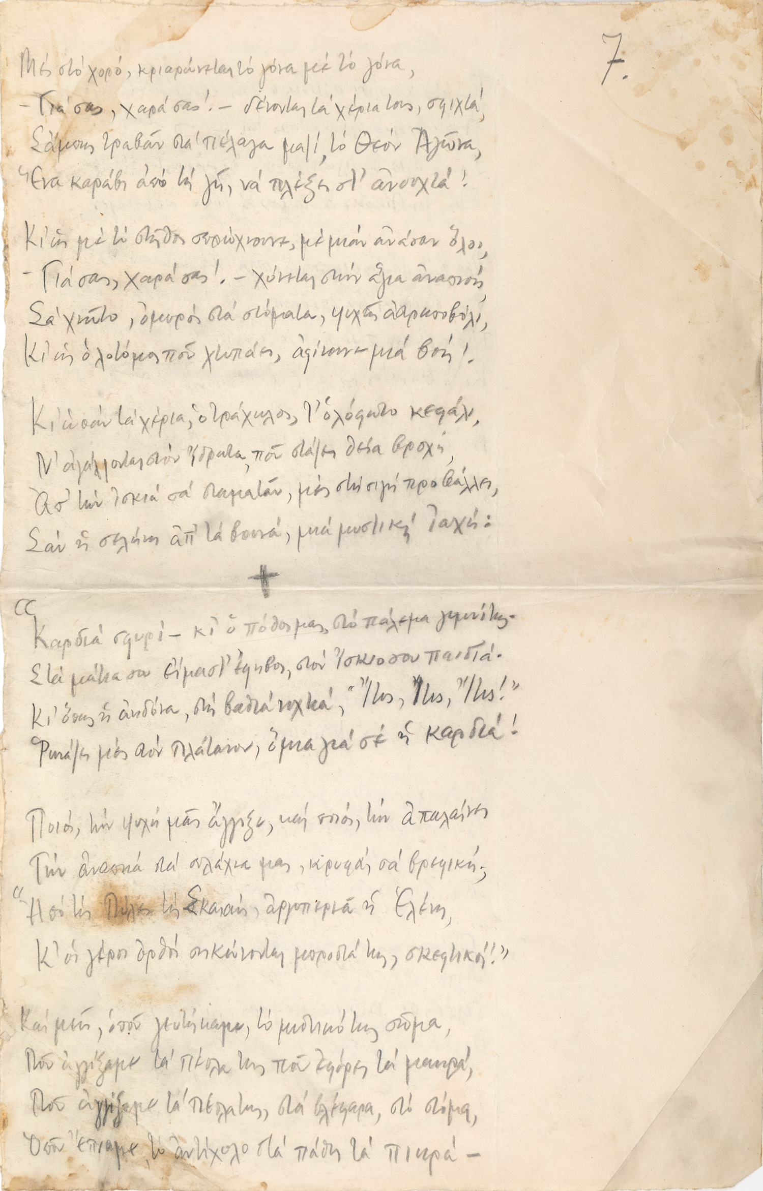 I. ΠΑΣΧΑ ΤΩΝ ΕΛΛΗΝΩΝ — Αὐτόγραφο ἀπόσπασμα τοῦ ποιήματός του «Πάσχα τῶν Ἑλλήνων, ΙΙ. Ὁ Ὕμνος στήν Ἑλένη», [στ. 9-108].