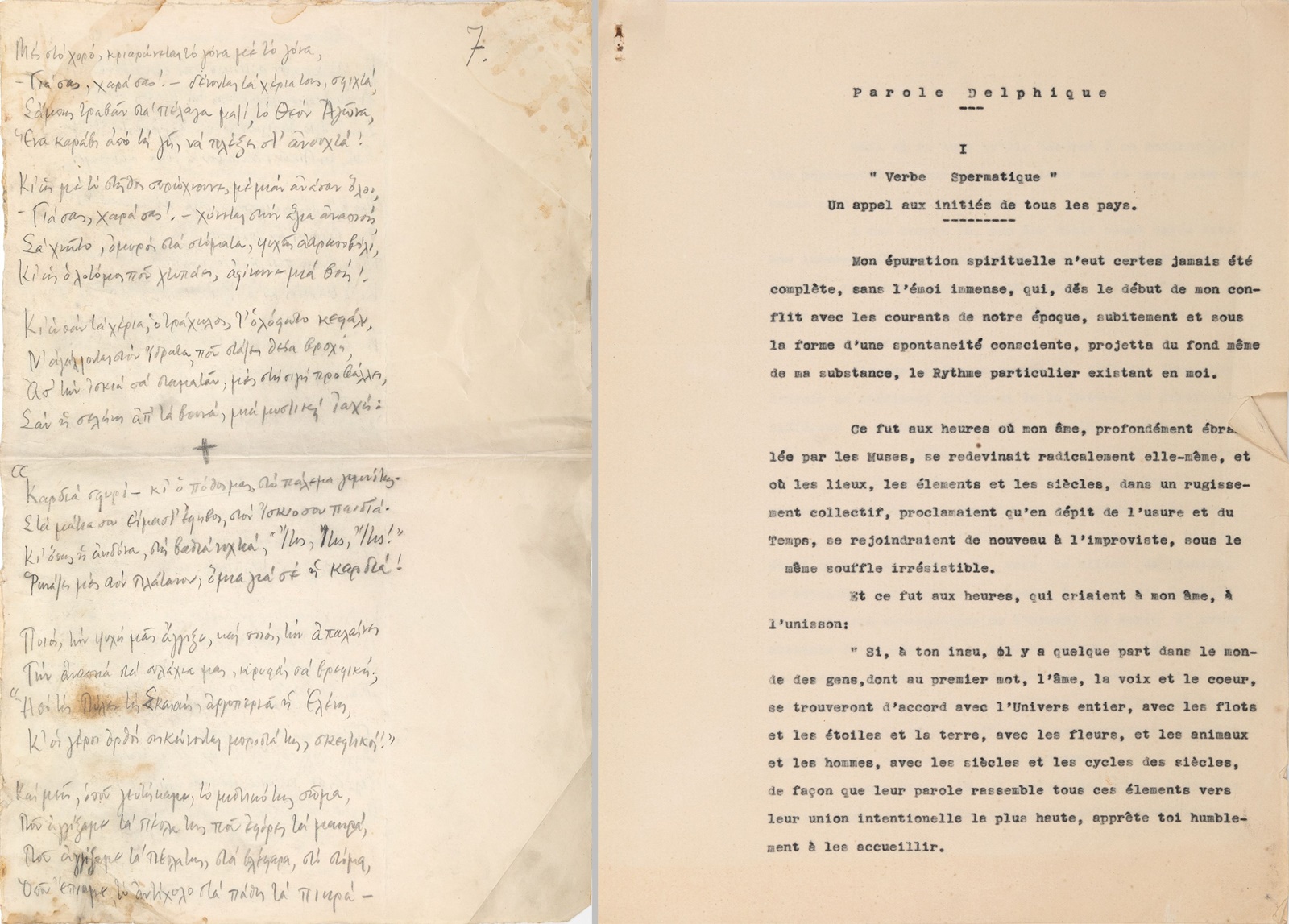 Γραμμένο με μολύβι σε 22 λυτά φύλλα, αριθμημένα 1-22, 365 x 243 mm. (ίχνη από οξείδωση συνδετήρων στα 2 πρώτα φύλλα, οι πίσω όψεις λευκές). Τίτλος στην αρχή του κειμένου («Parole Delphique. – Ι “Verbe Spermatique”. (Un appel aux initiés de tous les pays)). [μαζί:] Δακτυλογραφημένη μεταγραφή τοῦ αὐτογράφου. • 13 λυτά φύλλα, αριθμημένα 2-13, 285 x 215 mm. (οι πίσω όψεις λευκές). • Οι τελευταίες 10 γραμμές του δακτυλόγραφου δεν περι λαμβάνονται στο αυτόγραφο κείμενο, ωστόσο και η μεταγραφή παραμένει αποσπασματική. (35) • Το έργο Δελφικός Λόγος. Ι. Λόγος Σπερματικός [1928] αναφέρεται ως αυτοτελής έκδοση στη Βιβλιογραφία Α. Σικελιανού του Α. Γ. Κατσίμπαλη (Αθήνα 1946, σ. 10, αρ. 32) αλλά σύμφωνα με τον Γ. Π. Σαββίδη (βλ. Ὁ Ἐρανιστής, τ. Η´ , Αθήνα 1970, σ. [342]-344) δεν αποτελεί παρά τη συνέχεια της έκδοσης Δελφικός Λόγος, «Ἀρχά τῶν Ἀρίστων» (Αθήνα, Εστία, 1927, αρ. 9 της προαναφερθείσας βιβλιογραφίας), που για άγνωστους λόγους ο ποιητής προτίμησε να μην την εκδώσει ολοκληρωμένη. Επιπλέον ο Σικελιανός δημοσίευσε το παρόν πεζό κείμενο στο περιοδικό Πρωτοπορία (έτος Β´ , αρ. 1, Ιανουάριος 1930) με διαφορετικό τίτλο «Ἕνα παλιό μου ὀρφικό προανάκρουσμα γιά τούς Δελφούς» και με χρονολογική ένδειξη «Γραμμένο στό 921». • Για το πλήρες ελληνικό κείμενο βλ. Άγγελος Σικελιανός, Πεζός λόγος, Β´, Δελφικά (1921-1951), εἰσαγωγικό σημείωμα – φιλολογική ἐπιμέλεια Γ. Π. Σαββίδης, Ίκαρος, 1980, σ. 143-172.