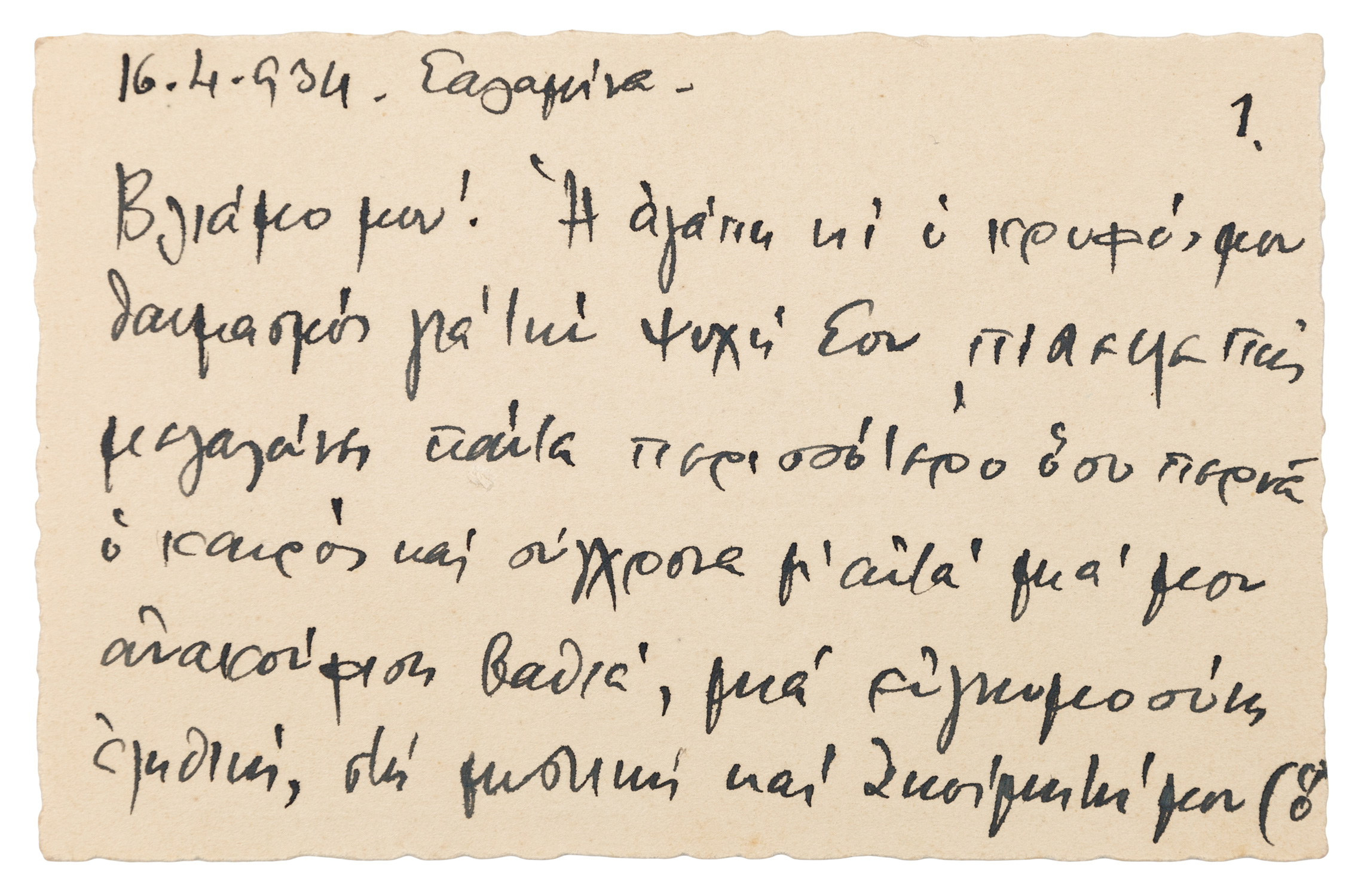 Η πρώτη και η τρίτη γραμμένες στις δύο όψεις μίας και δύο καρτών αντίστοιχα, 148 x 105 και 91 x 145 mm., η δεύτερη στις σ. [1] και [3] ενός διφύλλου, 175 x 142 mm. (οι σ. [2] και [4] λευκές). Μαζί οι φάκελοι. (7) • «… Ζῶ, ἀγαπημένε Βλιάμο, τοῦτο τόν καιρό βαθιά μου ἀδιάκοπα τό μεγάλο «κοσμικό δρᾶμα» καί οἱ ἀρτηρίες μου χτυπᾶν μέ τόν παλμό του. Ἄ, πότε θά ὡριμάσει τό Αἷμα μέσα τους, ν’ ἀνοίξουνε κρουνός νά μεταλάβουνε, ὡς μοῦ οἰωνίζεσαι, τό «Πάσχα», τό «παγκόσμιο» ὅλοι; Τάχα σίμωσε ὁ καιρός;…». • Βλ. Ἄγγελου Σικελιανοῦ, Γράμματα, φιλολογική ἐπιμέλεια Κώστας Μπουρναζάκης, Αθήνα, Ίκαρος, 2000, τ. Β´, σ. 103-4, 120 και 124.