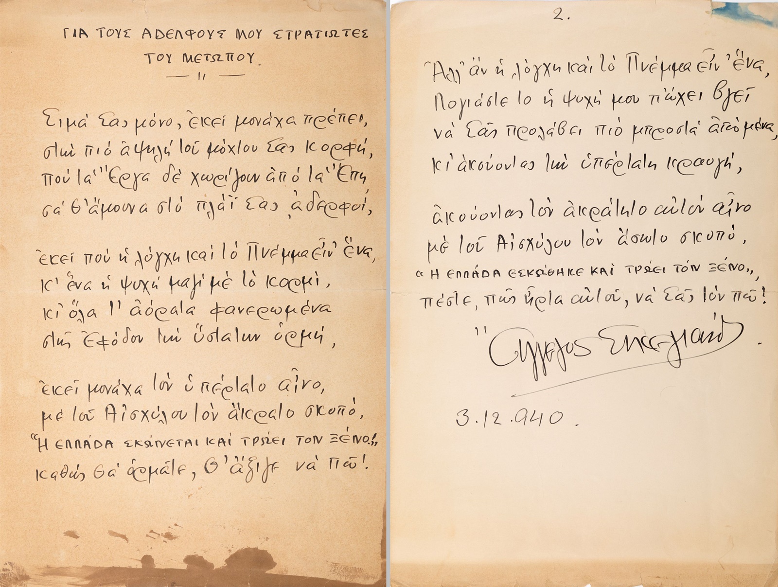 IV. Αὐτόγραφο τοῦ ποιήματός του «Γιά τούς ἀδελφούς μου στρατιώτες τοῦ μετώπου».