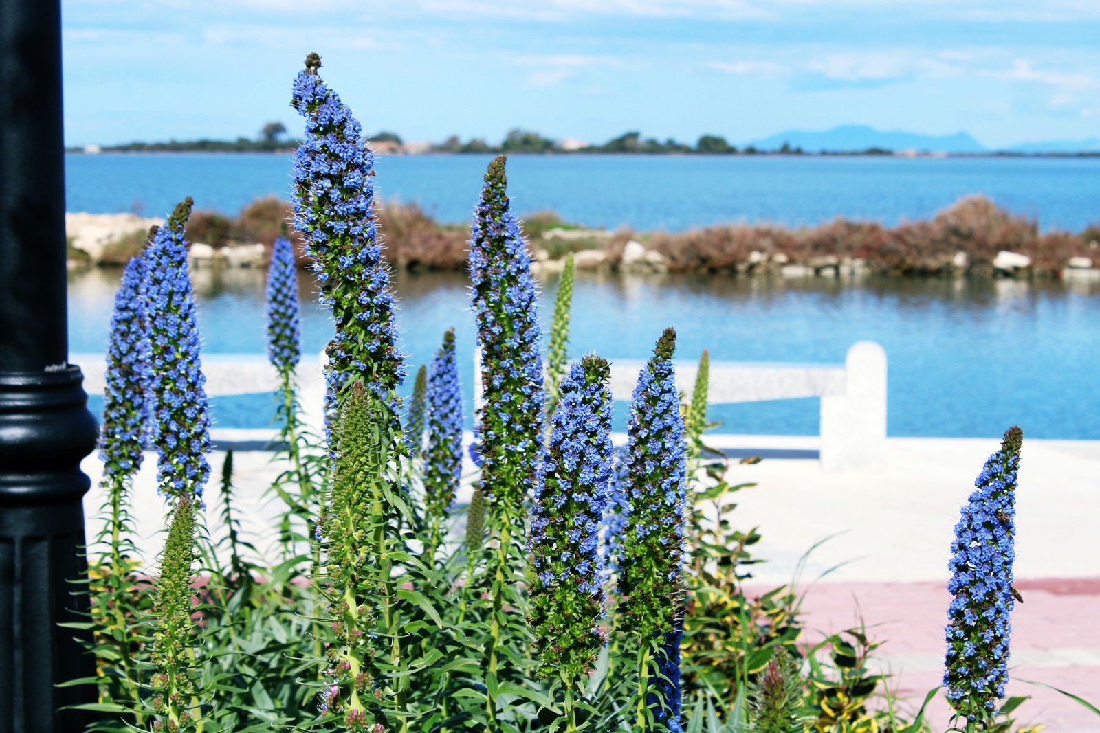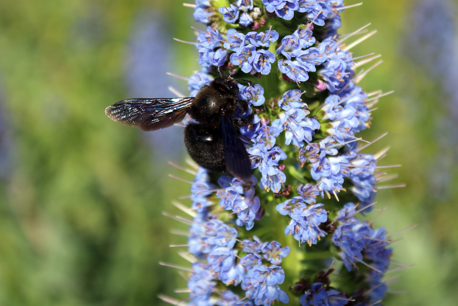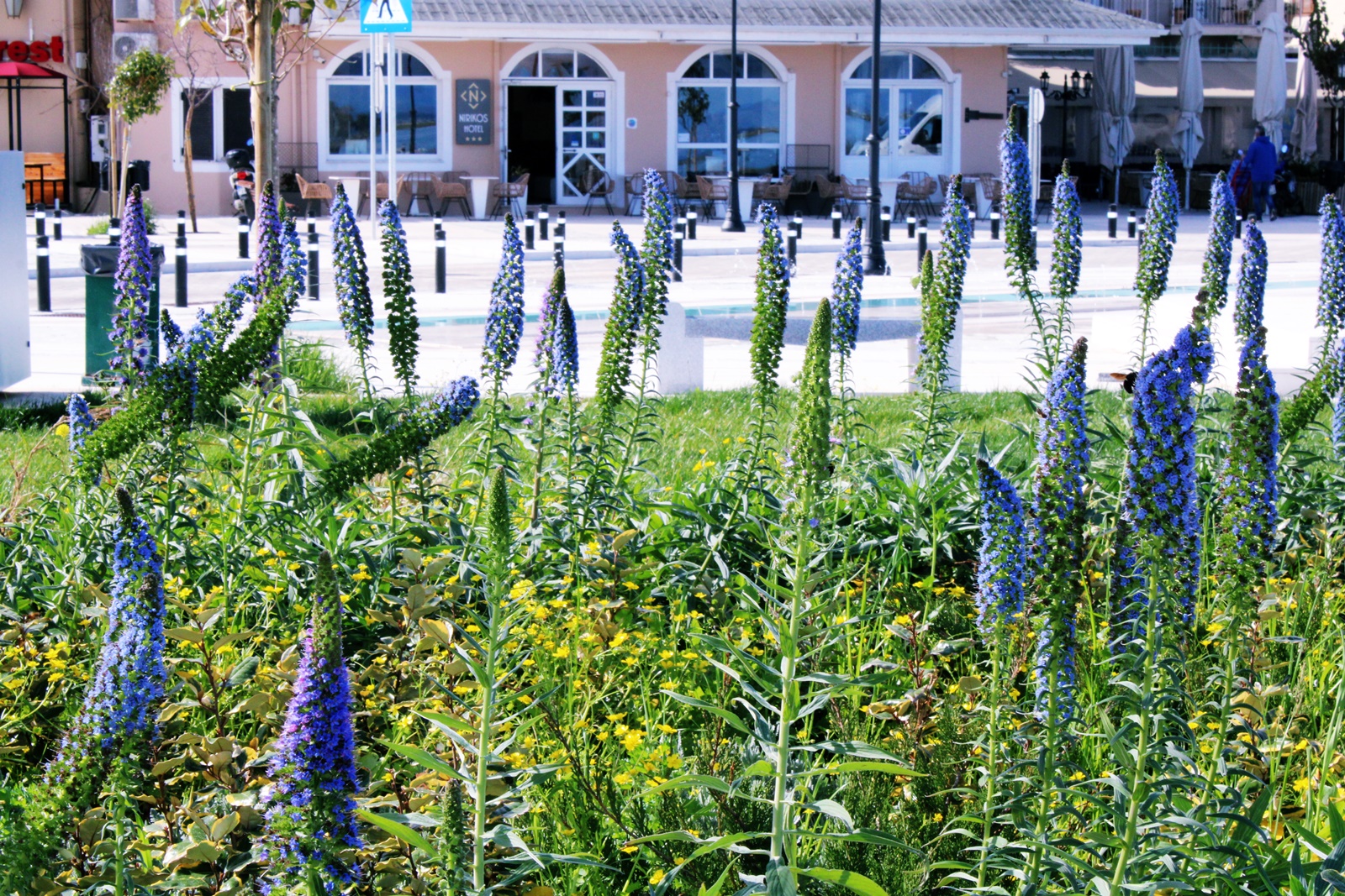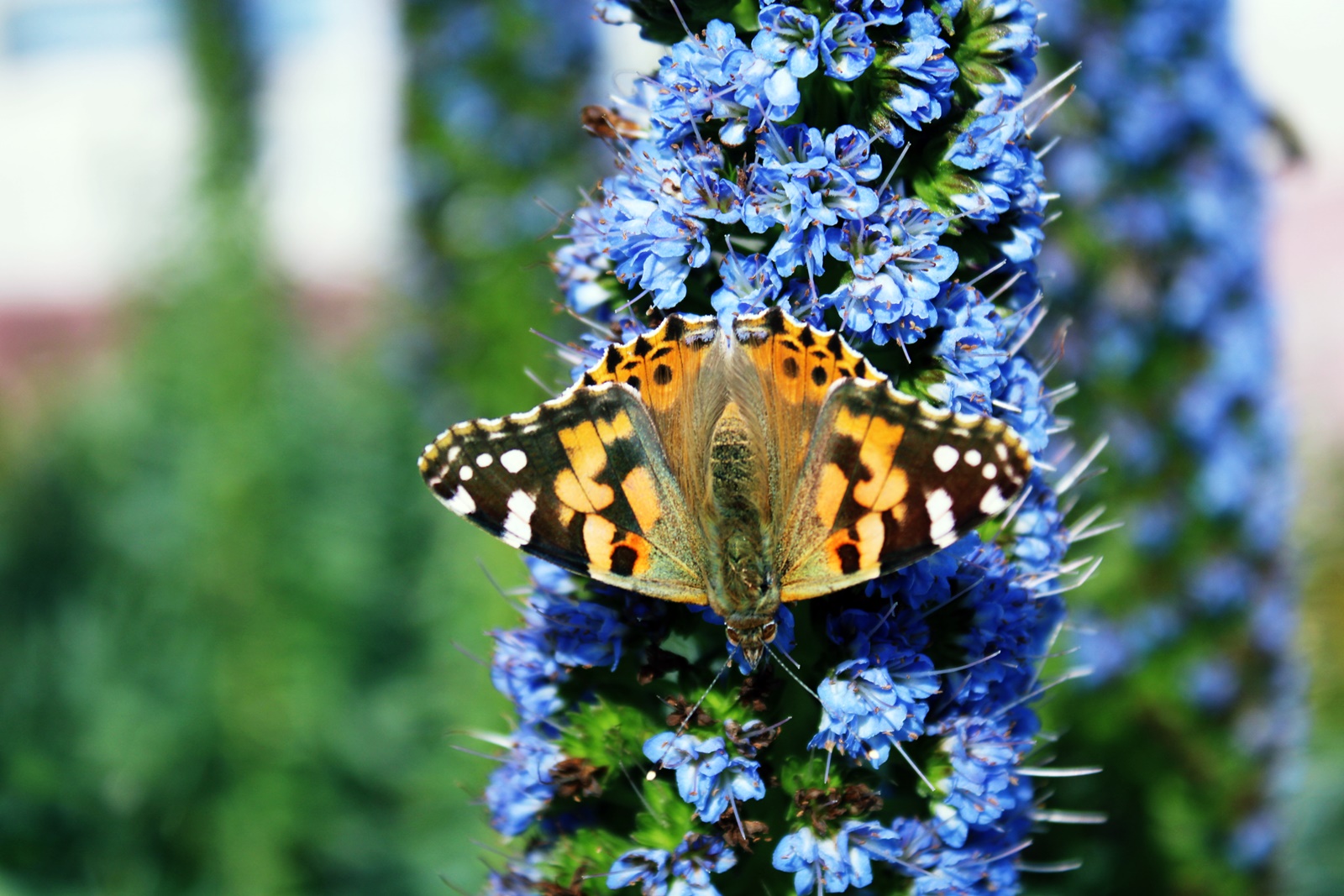 Την φωτογραφίσαμε σήμερα, 26 Φλεβάρη 2024, να συναγωνίζεται τις μέλισσες, τους σέρσελες και διάφορα άλλα έντομα πάνω στα έντονα μπλε άνθη του φυτού Έχιου (Echium candicans), ενός φυτού με καταγωγή από την Μαδέιρα, που έχει φυτευτεί στην παραλία της πόλης της Λευκάδας μετά την ανάπλασή της. Ένα φυτό που όπως διαβάζουμε προσαρμόζεται στην ξηρασία, ενώ αντέχει στο θαλασσινό αλάτι και προσφέρεται για παραθαλάσσιες και όχι μόνο συνθέσεις.