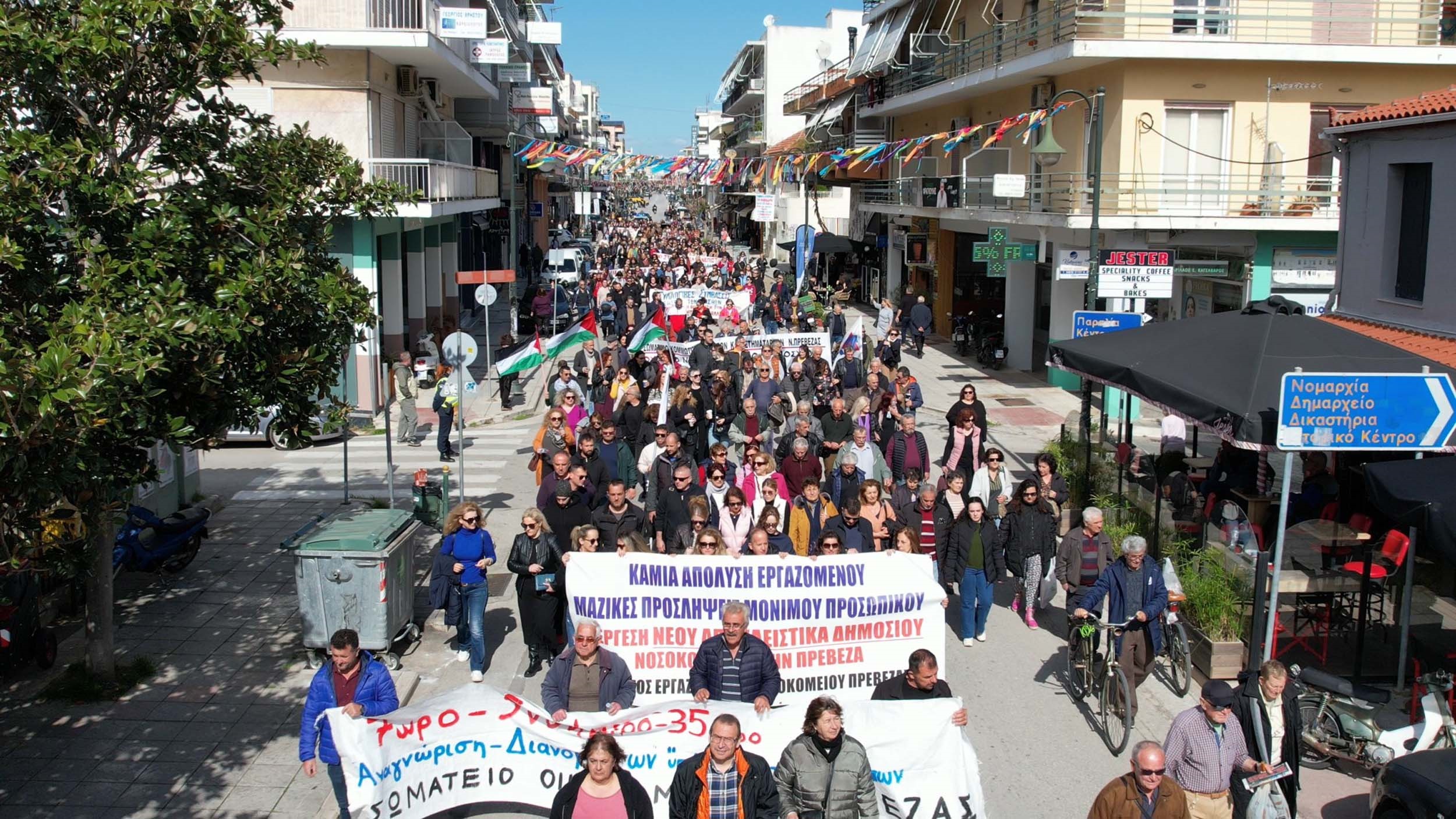 Από νωρίς το πρωί μέλη σωματείων έκαναν περιφρούρηση στη ΔΟΥ Πρέβεζας. Στη συνέχεια ο χώρος του Παλιού ΚΤΕΛ πλημμύρισε από μαθητές εργάτες, αγρότες, εκπαιδευτικούς και εργαζόμενους σε ΟΤΑ, Περιφέρεια και Νοσοκομείο.