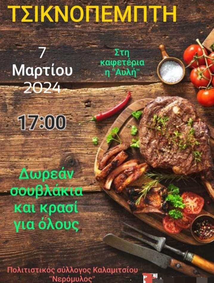 Ο Πολιτιστικός Σύλλογος Καλαμιτσίου «Νερόμυλος» προσκαλεί την Τσικνοπέμπτη 7 Μαρτίου 2024 και ώρα 17:00 στην καφετέρια η «Αυλή» όπου θα προσφερθούν δωρεάν σουβλάκια και κρασί για όλους.