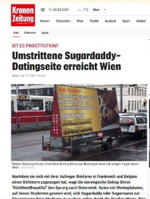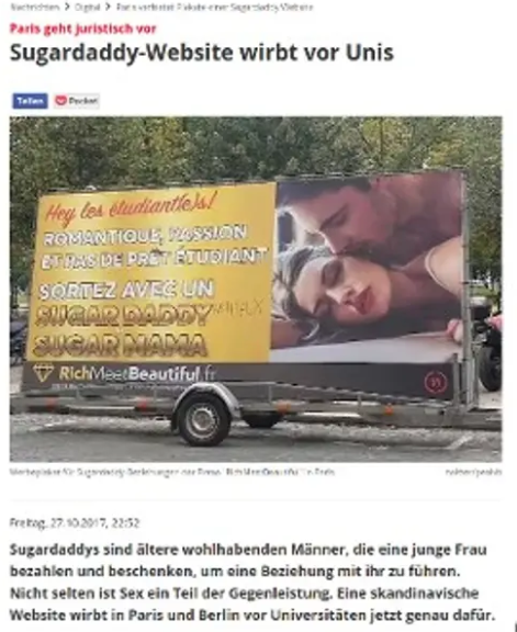– Γνωστό είναι ότι κύμα καταγγελιών προκάλεσαν και οι σχετικές διαφημιστικές αφίσες που έχουν κυκλοφορήσει κατά καιρούς, προωθώντας το «sugar daddy». Όπως στο Γκέτεμποργκ της Σουηδίας, που ανέγραφε «Γεια σας φοιτητές! Μηδέν δάνειο; Βγες ραντεβού με έναν sugar daddy». Ανάλογες καμπάνιες έχουν γίνει στο Βέλγιο, στη Γαλλία, στην Αυστρία, στις ΗΠΑ κ.α.