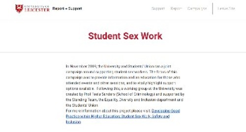Χαρακτηριστικά είναι όσα διαβάζουμε στην επίσημη ιστοσελίδα του Πανεπιστημίου του Leicester, με τίτλο «Σεξεργασία Φοιτητών»: «Τον Νοέμβριο του 2019, η Ενωση Πανεπιστημίων και Φοιτητών πραγματοποίησε εκστρατεία για την υποστήριξη των φοιτητών – σεξουαλικά εργαζομένων. Το επίκεντρο αυτής της εκστρατείας ήταν η παροχή πληροφοριών και εκπαίδευσης σε όσους παρακολούθησαν εκδηλώσεις και άλλες συνεδρίες, και να τονίσει τις διαθέσιμες επιλογές υποστήριξης. Στη συνέχεια δημιουργήθηκε μια ομάδα εργασίας στο Πανεπιστήμιο από την καθηγήτρια Teela Sanders (Σχολή Εγκληματολογίας) και υποστηρίχθηκε από τη Μόνιμη Ομάδα, το Τμήμα Ισότητας, Διαφορετικότητας και Συμπερίληψης και την Ενωση Φοιτητών».