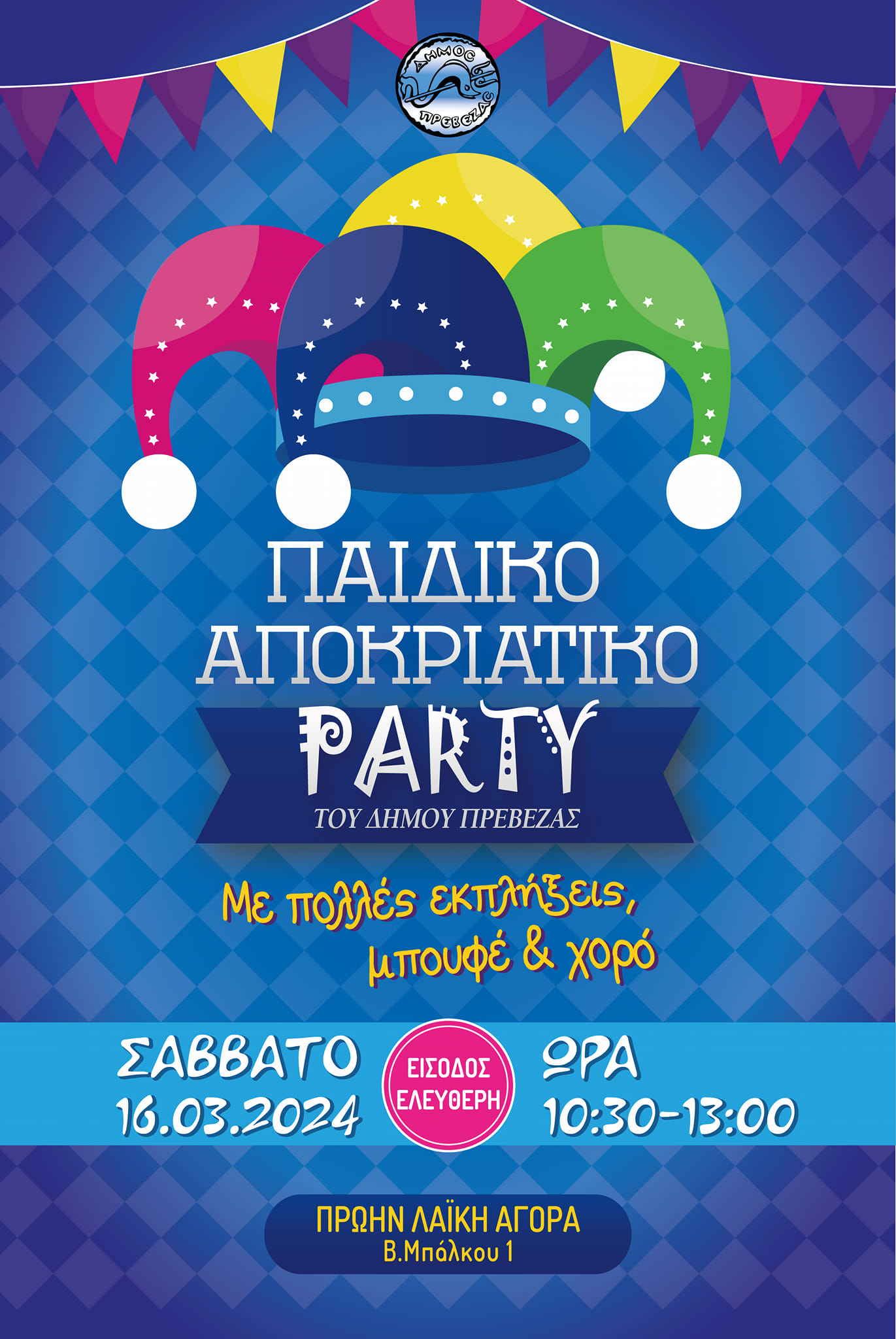 Ο Δήμος Πρέβεζας διοργανώνει αποκριάτικη γιορτή με πολλές εκπλήξεις, μουσική και χορό για όλους τους μικρούς του φίλους.