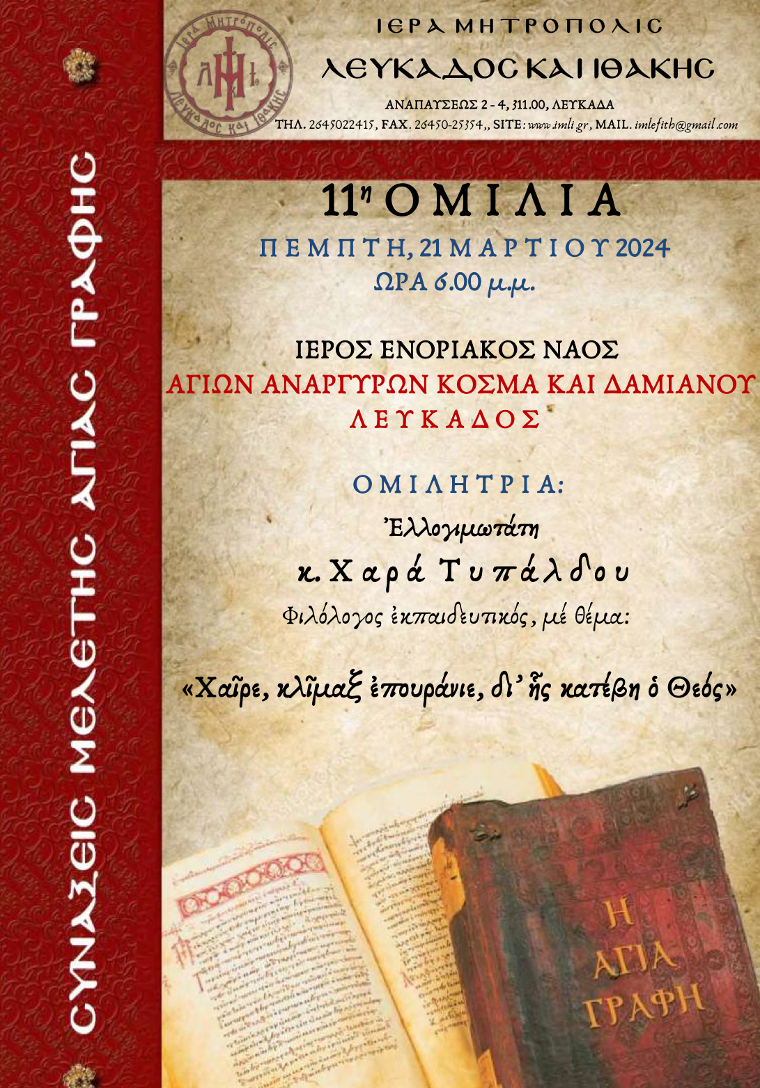 Όπως ενημερώνει η Μητρόπολη Λευκάδας και Ιθάκης, την Πέμπτη 21 Μαρτίου 2024, στις 6:00 μ.μ., στον ΙΝ Αγίων Αναργύρων Κοσμά και Δαμιανού στην πόλη της Λευκάδας, στο πλαίσιο των συνάξεων μελέτης της Αγίας Γραφής, θα μιλήσει Ἐλλογιμωτάτη κ. Χ α ρ ά Τ υ π ά λ δ ο υ, Φιλόλογος ἐκπαιδευτικός, μέ θέμα: «Χαῖρε, κλῖμαξ ἐπουράνιε, δι’ ἧς κατέβη ὁ Θεός».