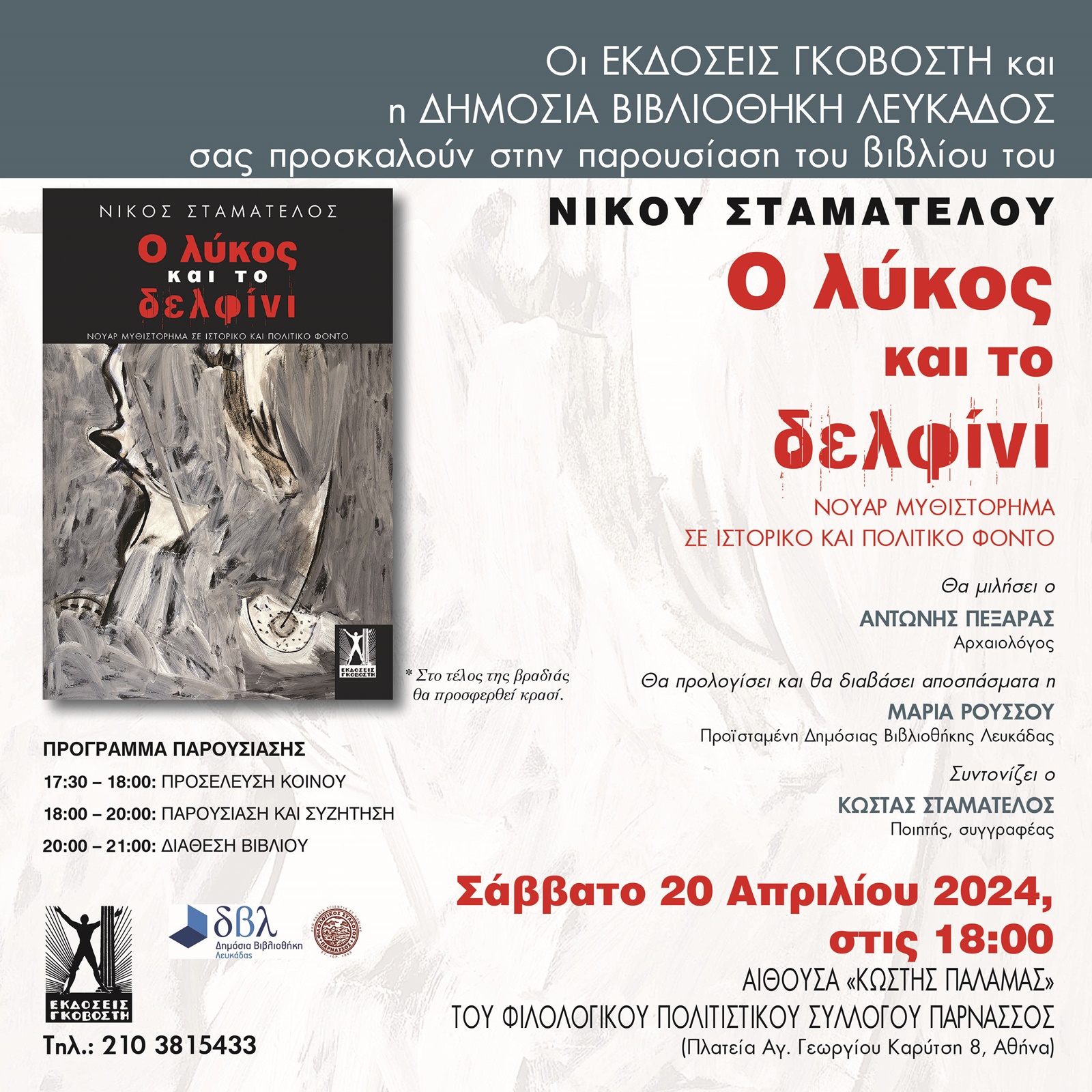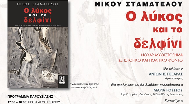 Οι εκδόσεις Γκοβόστη και η Δημόσια Βιβλιοθήκη Λευκάδας σας προσκαλούν στην παρουσίαση του βιβλίου «Ο λύκος και το δελφίνι» του Νίκου Σταματέλου που θα πραγματοποιηθεί το Σάββατο 20 Απριλίου 2024, στις 18:00, στην αίθουσα «Κωστής Παλαμάς» του Φιλολογικού Πολιτιστικού Συλλόγου Παρνασσός (Πλατεία Αγ. Γεωργίου Καρύτση 8, Αθήνα).