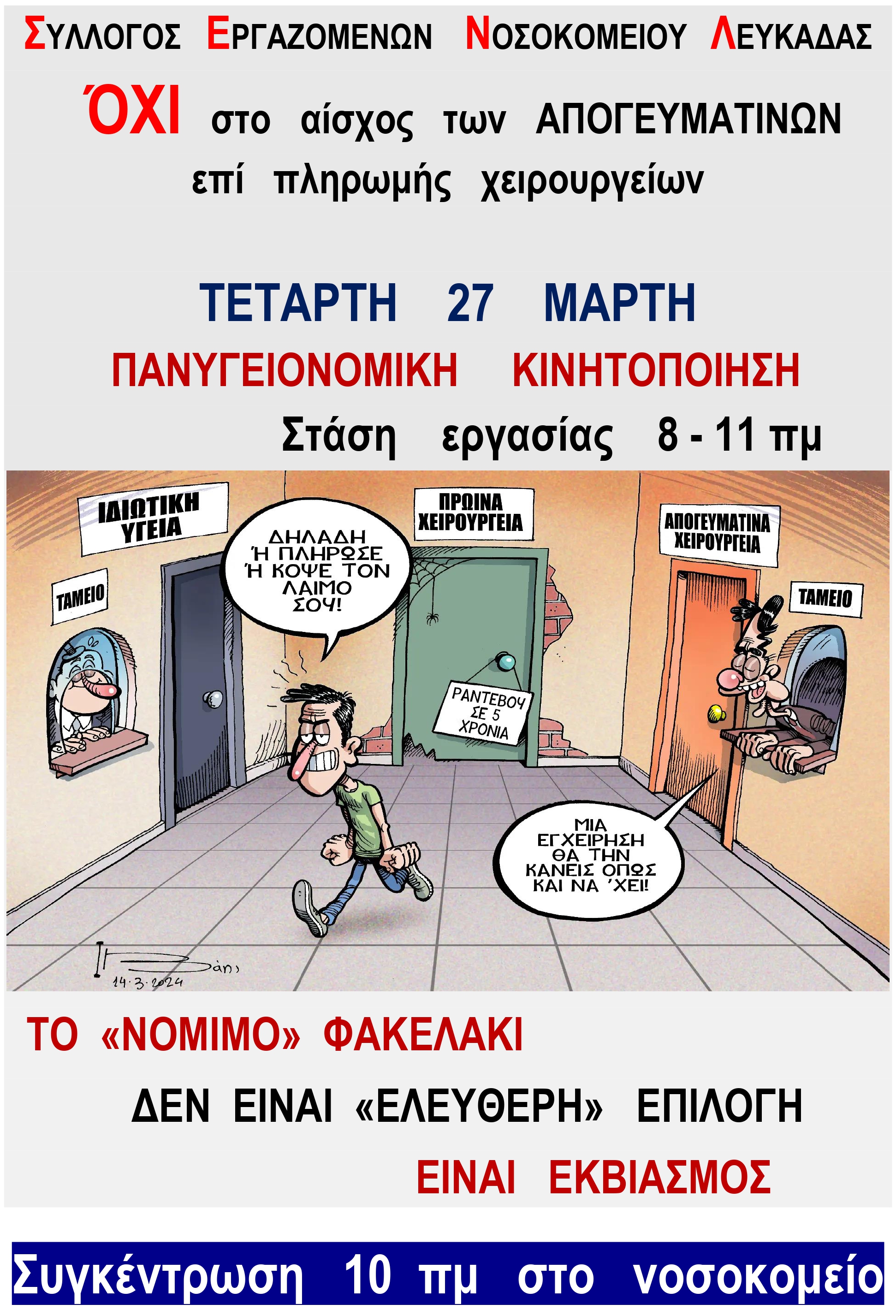 Σε συμμετοχή στη στάση εργασίας την Τετάρτη 27 Μάρτη, από τις 8:00 π.μ. έως τις 11:00 π.μ. αλλά και στην κινητοποίηση στις 10:00 π.μ. στο νοσοκομείο, ενάντια στα απογευματινά επί πληρωμή χειρουργεία καθώς και για την ανάγκη για δημόσια και δωρεάν Υγεία για όλους, καλεί ο Σύλλογος Εργαζομένων του νοσοκομείου Λευκάδας.