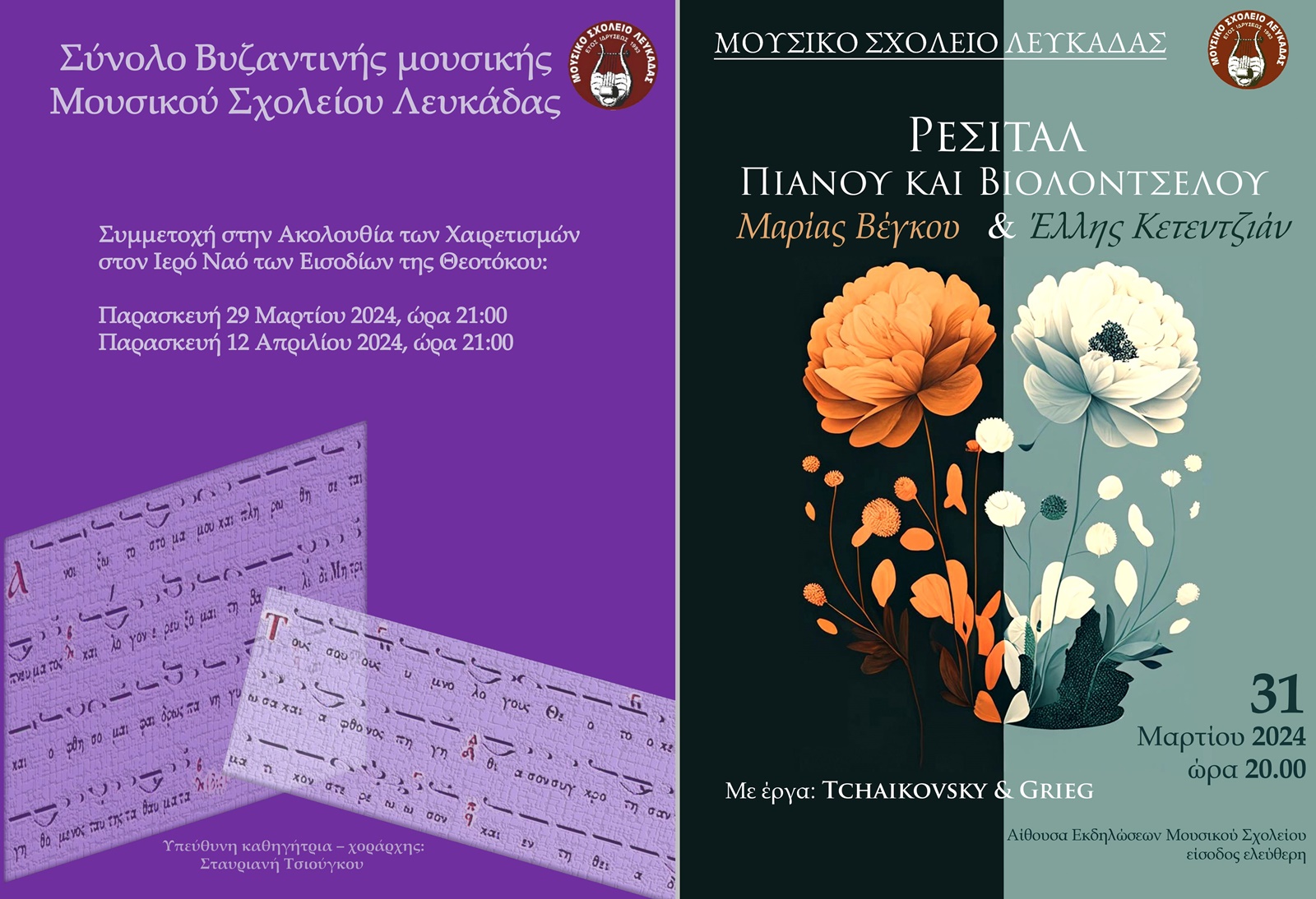 2. Την Κυριακή 31/3/2024 θα πραγματοποιηθεί το ρεσιτάλ πιάνου και βιολοντσέλου στην αίθουσα εκδηλώσεων του Μουσικού Σχολείου στις 20.00