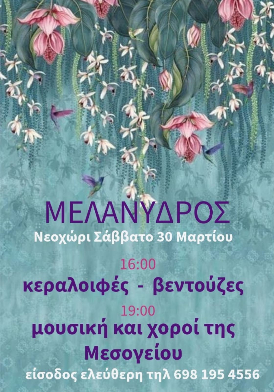 Ο Πολιτιστικός Σύλλογος Νεοχωρίου ΜΕΛΑΝΥΔΡΟΣ σας προσκαλεί το Σάββατο 30 Μαρτίου στο σχολείο στο Νιοχώρι σε ένα σεμινάριο παρασκευής κεραλοιφών και στην επίδειξη της παραδοσιακής θεραπείας με βεντούζες! Θα ακολουθήσει μουσικό πρόγραμμα!