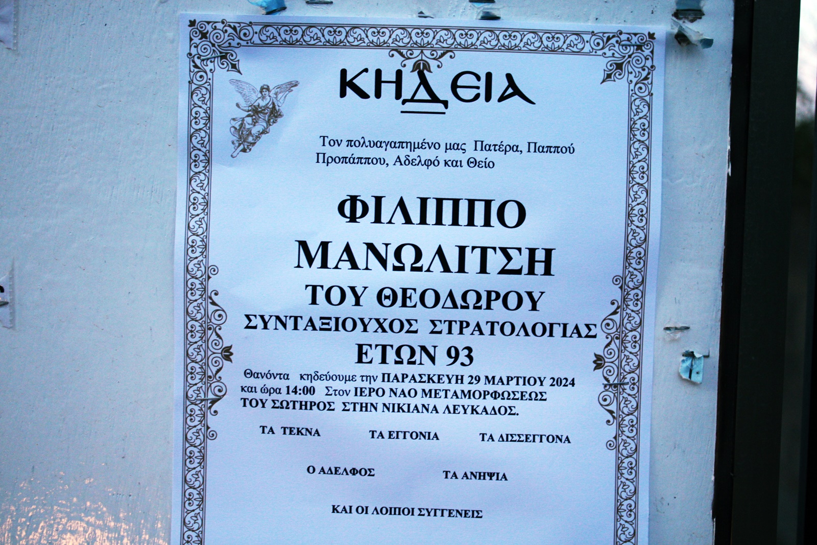 Πέθανε σε ηλικία 93 ετών ο Φίλιππος Μανωλίτσης του Θεοδώρου, συνταξιούχος Στρατολογίας.