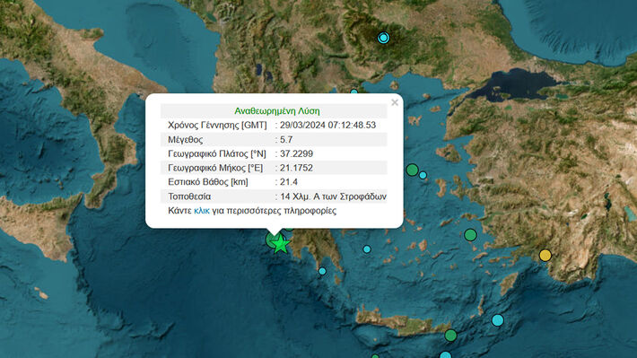 Το Γεωδυναμικό Ινστιτούτου του Εθνικού Αστροσκοπείου Αθηνών, αν και αρχικά είχε δώσει δύο δονήσεις μεγέθους, 5,6 και 5,7 Ρίχτερ στο σημείο, προχώρησε σε διόρθωση ανακοινώνοντας 5,7 Ρίχτερ, 14 χιλιόμετρα ανατολικά των Στροφάδων και με εστιακό βάθος 21,4 χιλιόμετρα.