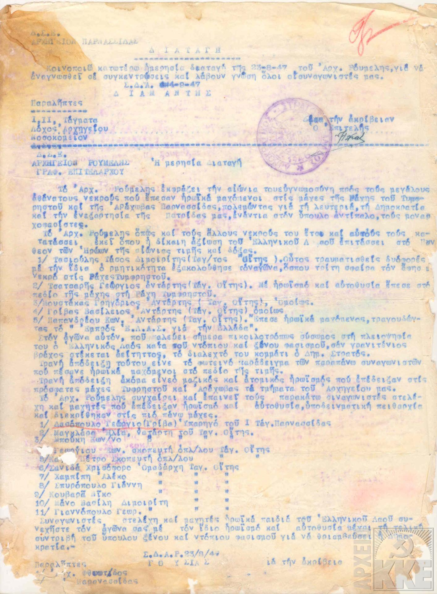 Αρχηγείο Παρνασσίδας 1946-1947 – Ημερήσια Διαταγή καπετάν-Διαμαντή (Πηγή: Αρχείο ΚΚΕ)