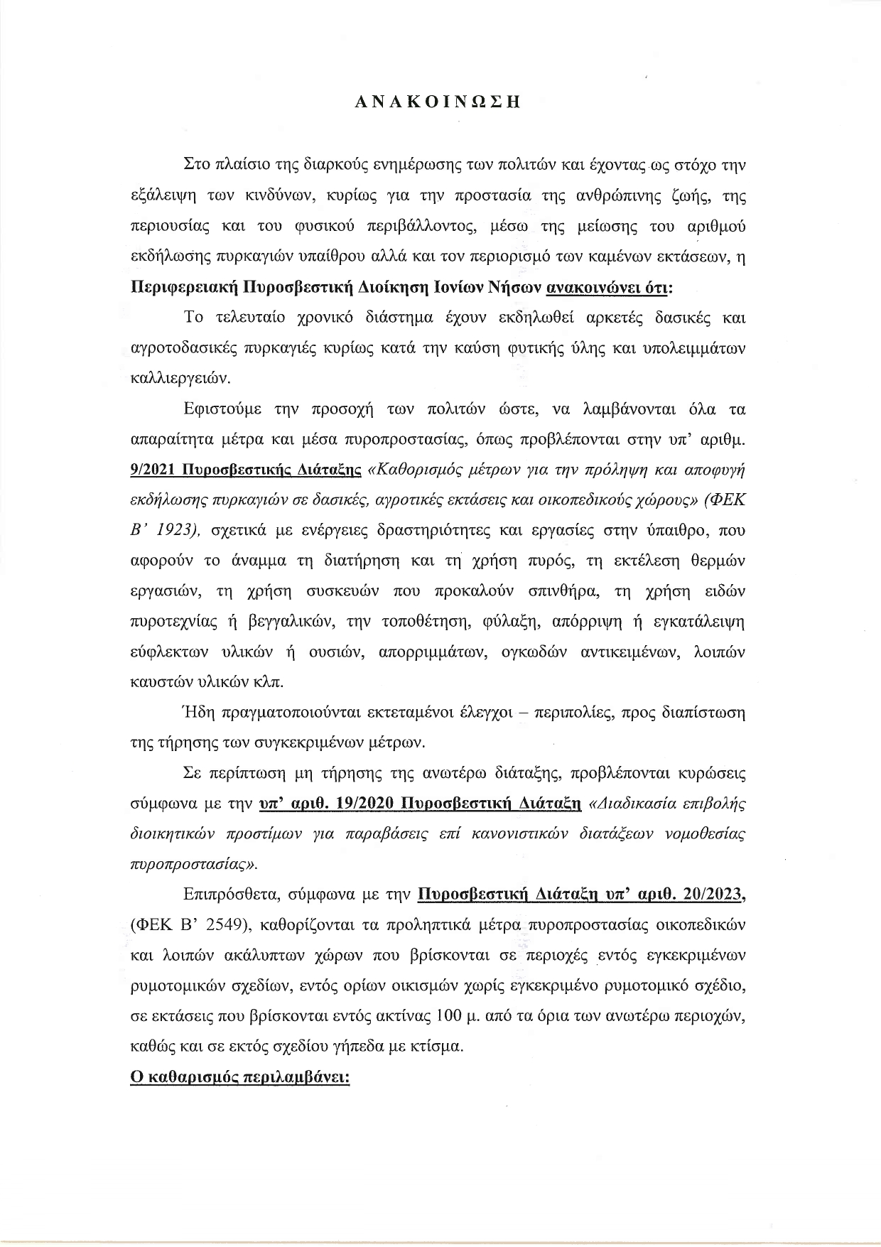 Στο πλαίσιο της διαρκούς ενημέρωσης των πολιτών και έχοντας ως στόχο την εξάλειψη των κινδύνων, κυρίως για την προστασία της ανθρώπινης ζωής, της περιουσίας και του φυσικού περιβάλλοντος, μέσω της μείωσης του αριθμού εκδήλωσης πυρκαγιών υπαίθρου αλλά και τον περιορισμό των καμένων εκτάσεων, η Περιφερειακή Πυροσβεστική Διοίκηση Ιονίων Νήσων ανακοινώνει ότι: