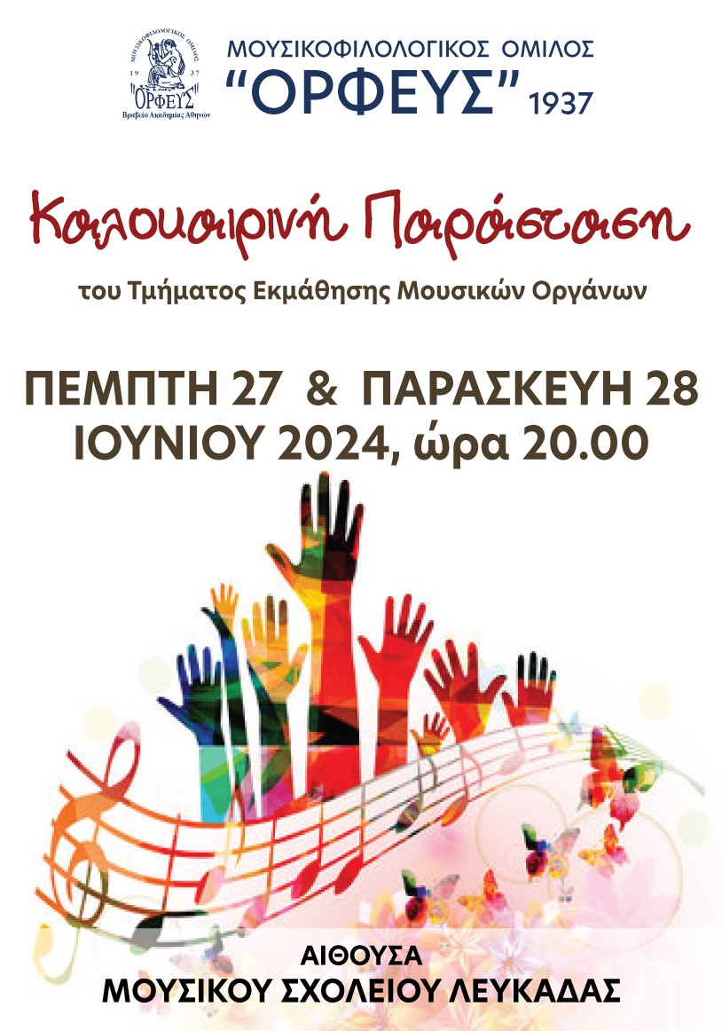 Ο Μουσικοφιλολογικός Όμιλος Λευκάδας «ΟΡΦΕΥΣ» προσκαλεί στην καλοκαιρινή παράσταση του τμήματος εκμάθησης μουσικών οργάνων που διοργανώνει την Πέμπτη 27 Ιουνίου και την Παρασκευή 28 Ιουνίου 2024 και ώρα 20:00 στην αίθουσα εκδηλώσεων του Μουσικού σχολείου Λευκάδας.