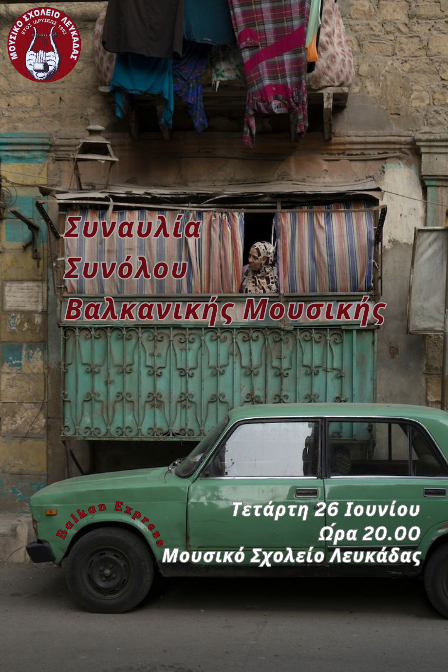 Σήμερα, Τετάρτη 26 Ιουνίου, και ώρα 20:00 στην Αίθουσα Εκδηλώσεων του Μουσικού Σχολείου θα πραγματοποιηθεί η συναυλία του Συνόλου Βαλκανικής Μουσικής του Μουσικού Σχολείου Λευκάδας.