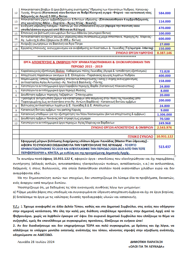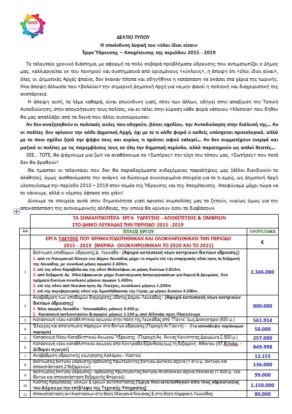 Είναι επικίνδυνη η λογική του «όλοι οι ίδιοι είναι», σημειώνει σε ανακοίνωσή της η δημοτική παράταξη «Όλοι για τη Λευκάδα», και δίνει στη δημοσιότητα στοιχεία για το τι έπραξαν ως Δημοτική Αρχή την περίοδο 2015-2019 στον τομέα της Ύδρευσης-Αποχέτευσης.