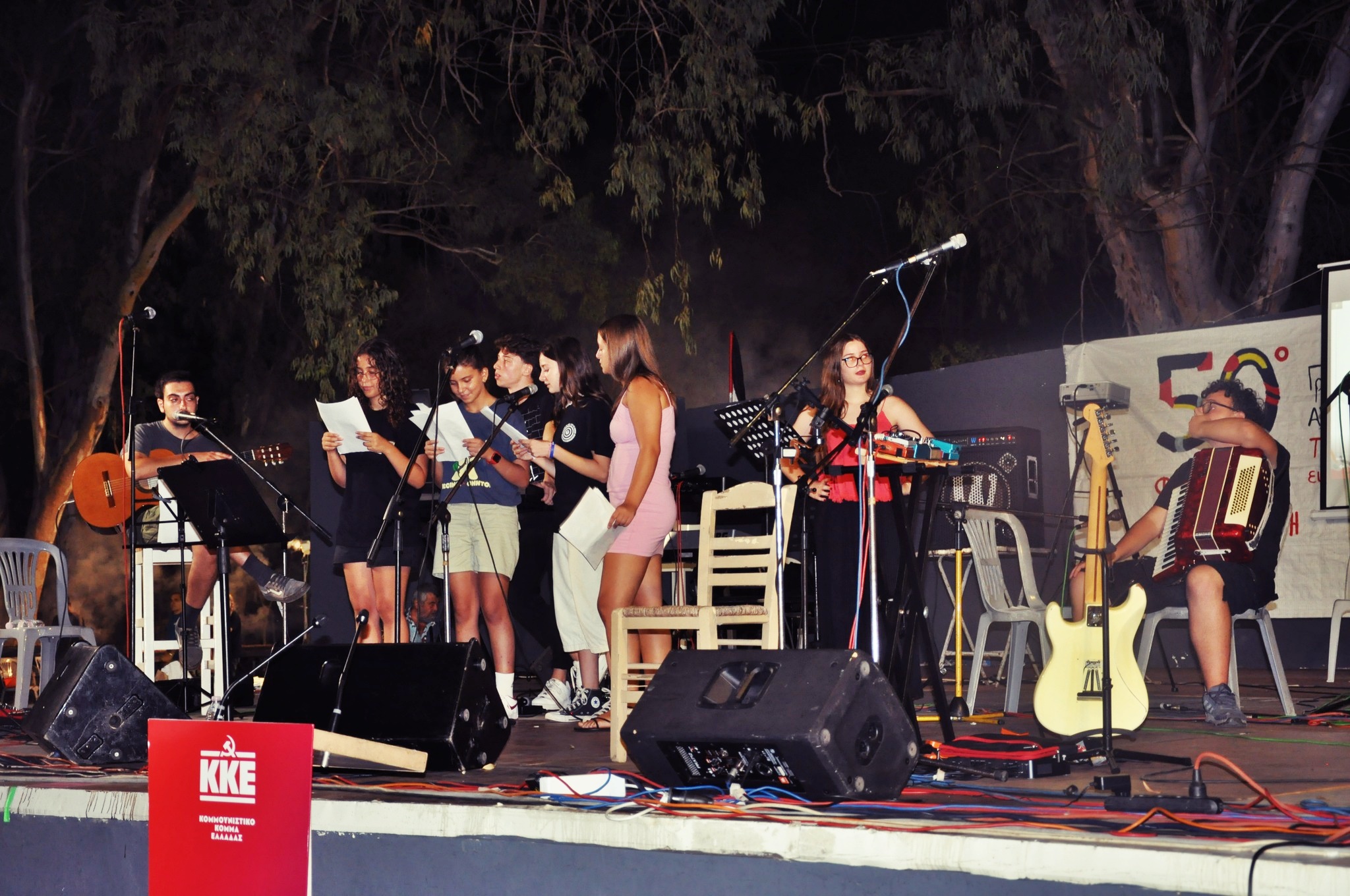 Το βράδυ του Σαββάτου μέλη και φίλοι της ΚΝΕ πραγματοποίησαν μουσικοαφηγηματικό αφιέρωμα για τα 50 χρόνια του Φεστιβάλ κάνοντας αναδρομή στο θεσμό, την εξέλιξή του και τα πολιτικά μηνύματα που εκπέμπονται προς την κοινωνία και ειδικότερα τη νεολαία.