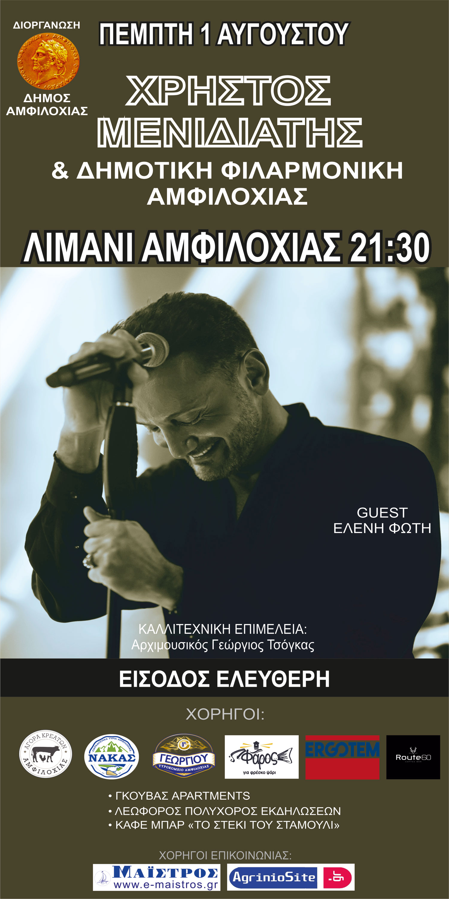 Συναυλία της Δημοτικής Φιλαρμονικής Αμφιλοχίας με τον Χρήστο Μενιδιάτη στο Λιμάνι Αμφιλοχίας την Πέμπτη 1 Αυγούστου