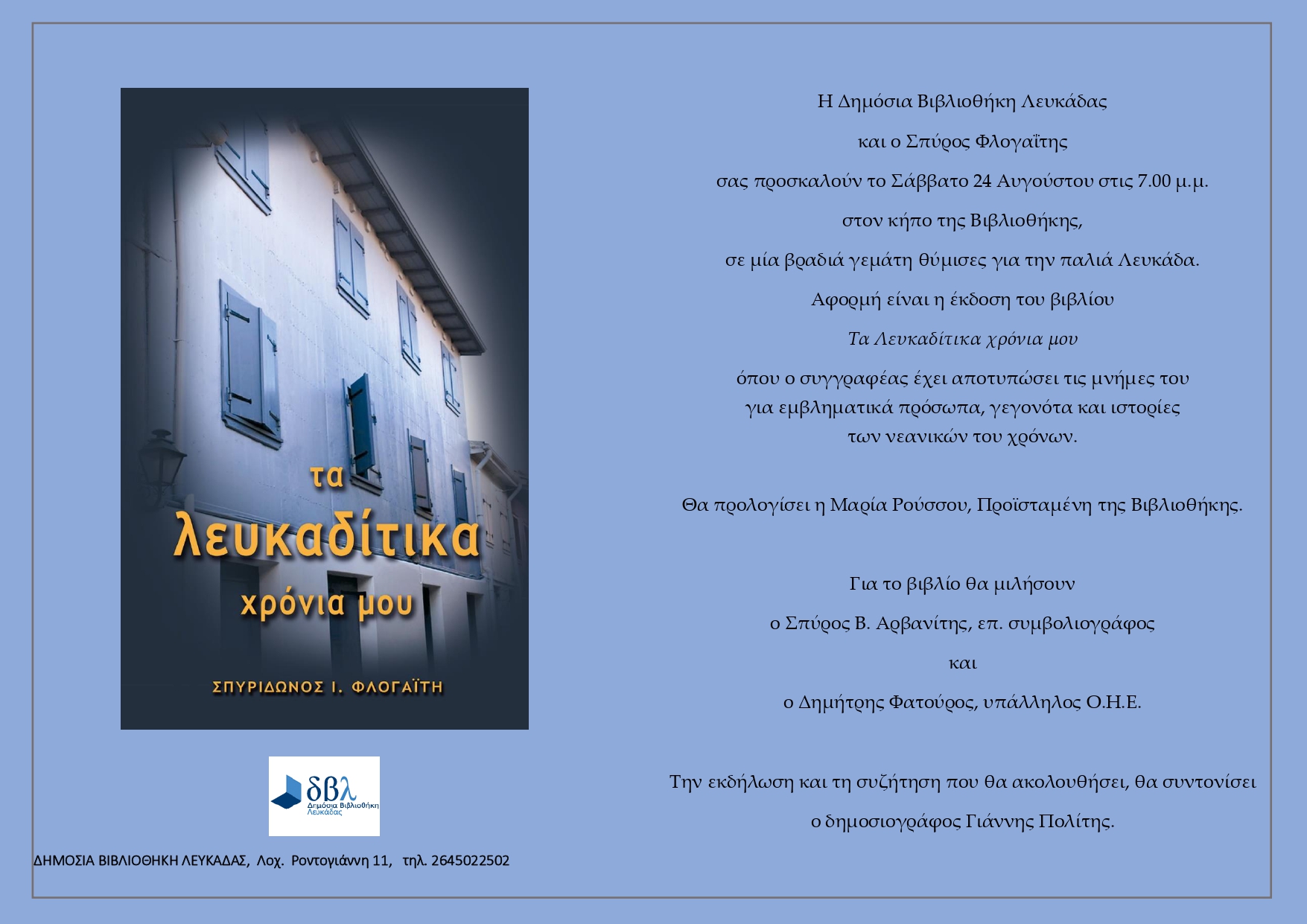 Η Δημόσια Βιβλιοθήκη Λευκάδας και ο Σπύρος Φλογαΐτης σας προσκαλούν το Σάββατο 24 Αυγούστου στις 7.00 μ.μ. στον κήπο της Βιβλιοθήκης, σε μία βραδιά γεμάτη θύμισες για την παλιά Λευκάδα.