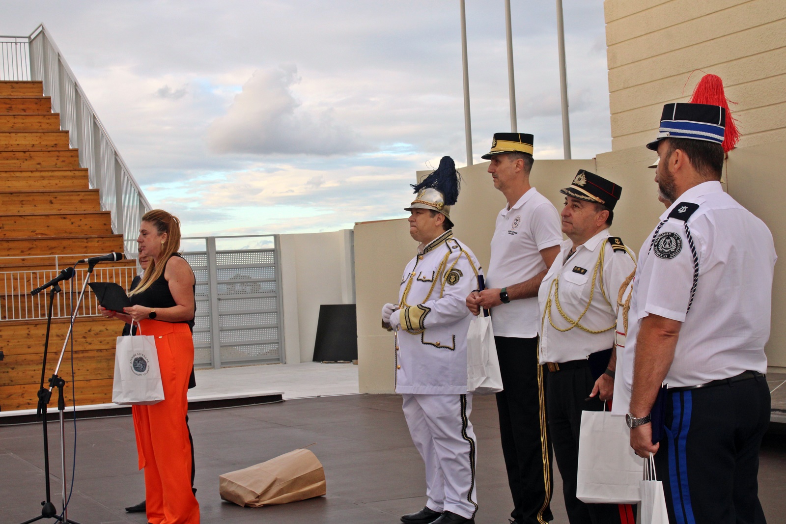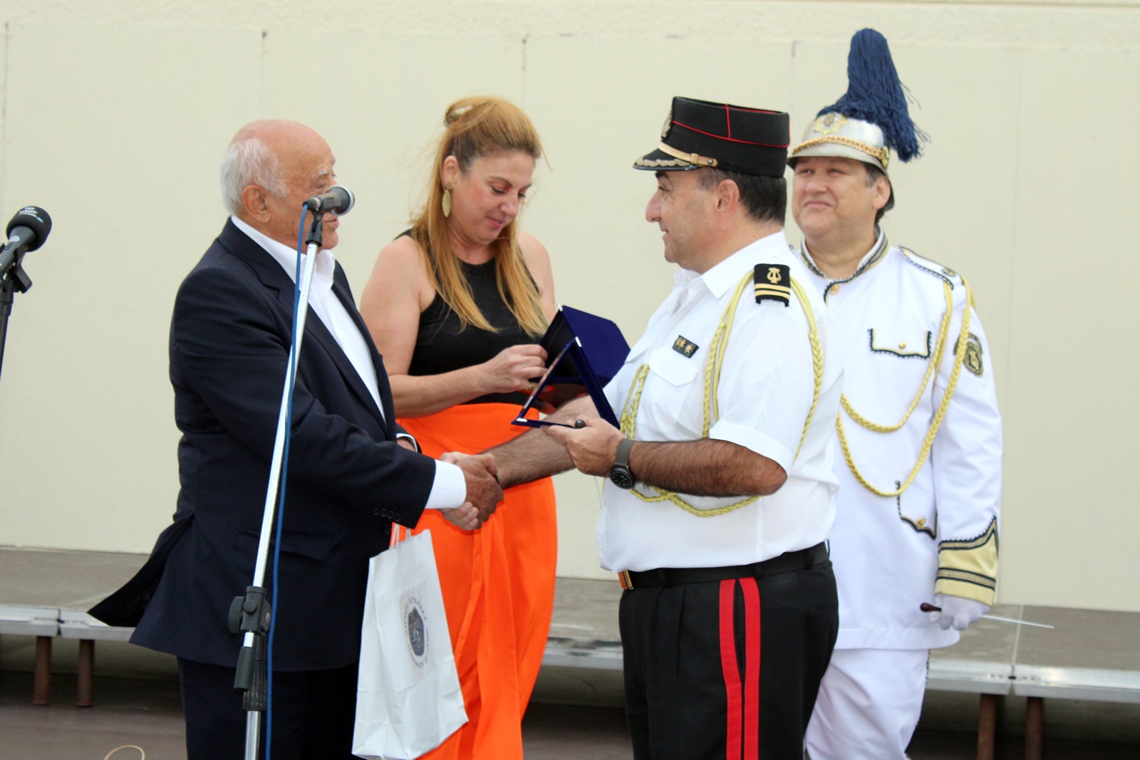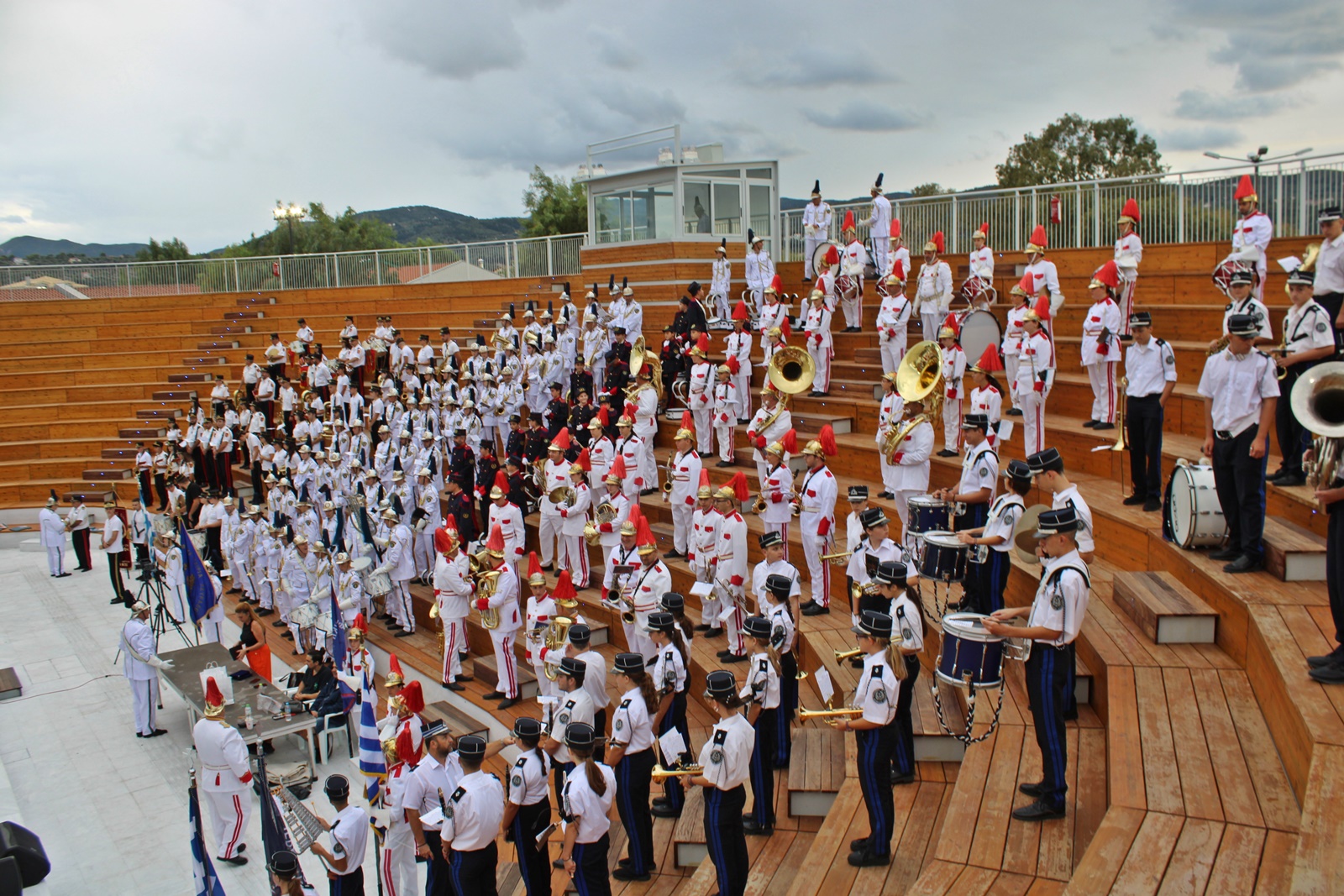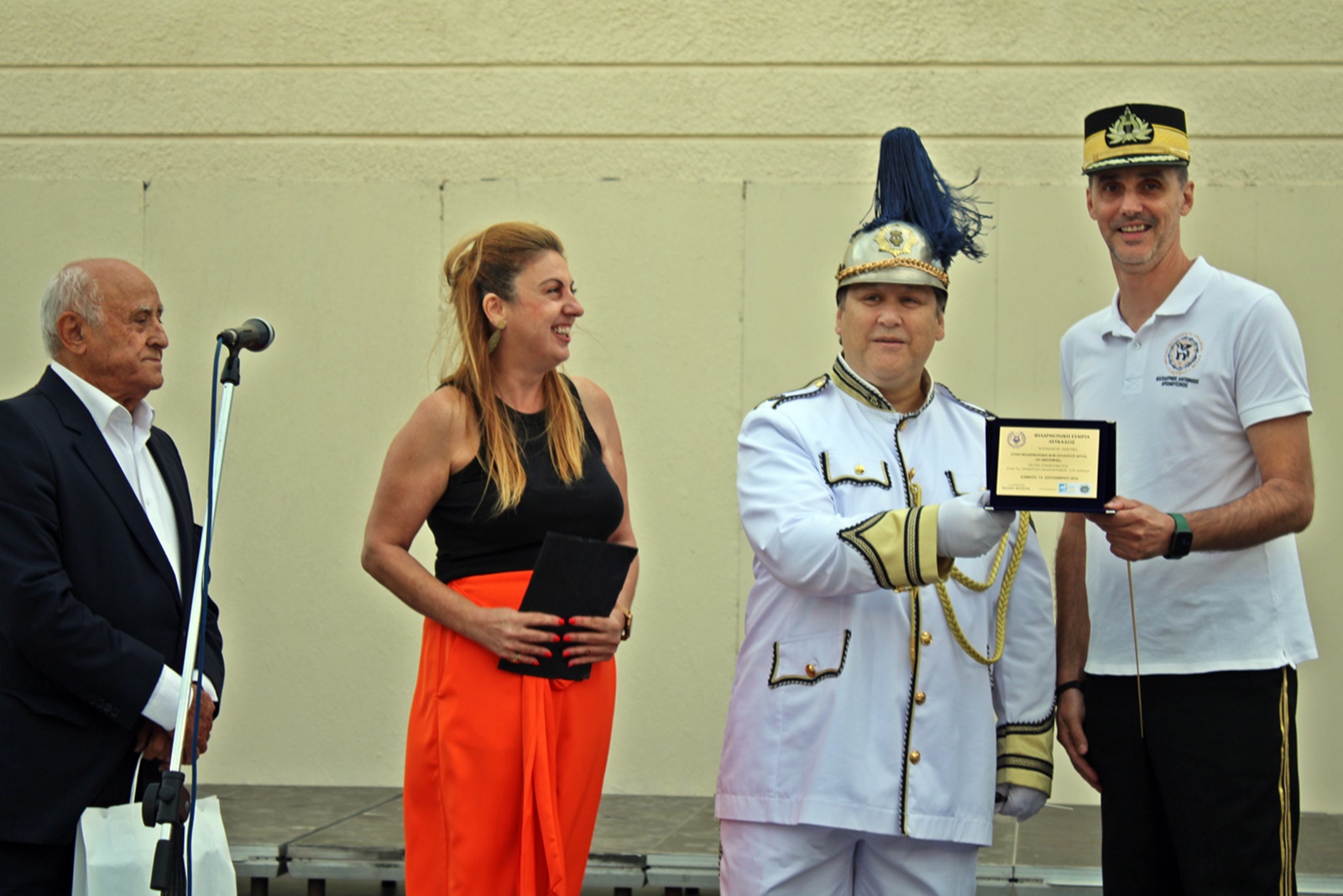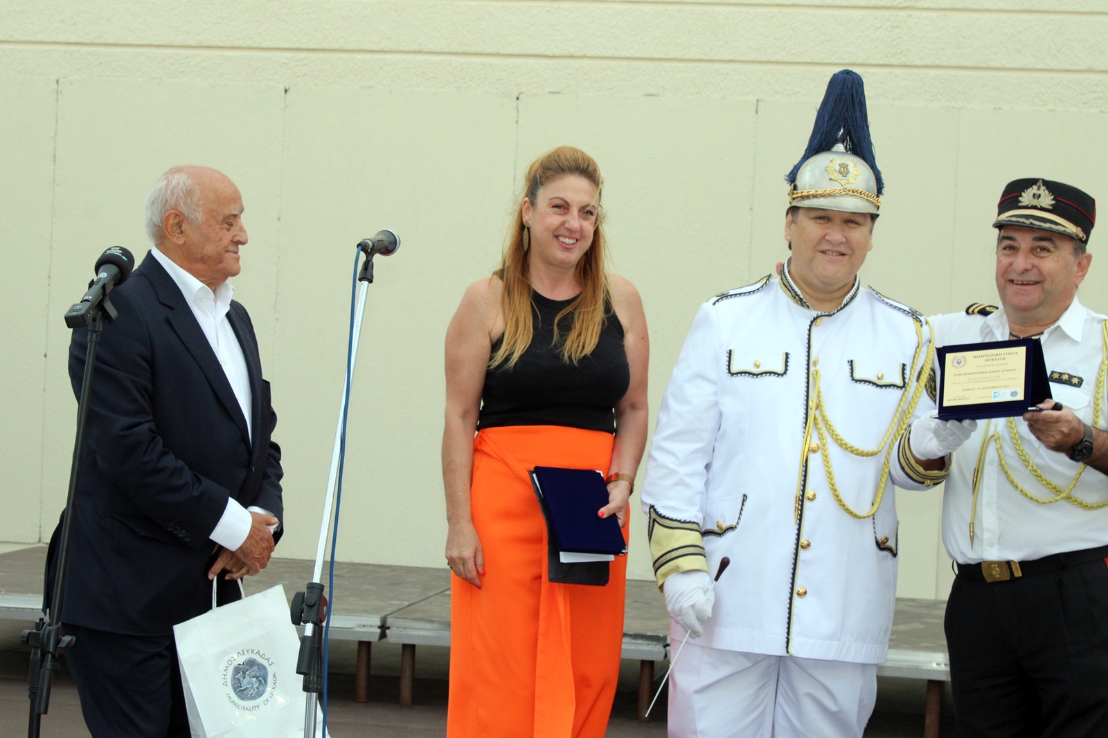 Η εκδήλωση ξεκίνησε με την υποδοχή, τους χαιρετισμούς και την απονομή τιμητικών πλακετών στο Ανοιχτό Θέατρο Λευκάδας. Τους καλεσμένους καλωσόρισε η πρόεδρος της Φιλαρμονικής Λευκάδας, κα Βασιλική Μήτσουρα, η οποία αφού ευχαρίστησε τις φιλοξενούμενες Φιλαρμονικές για την ανταπόκριση στο κάλεσμα, είπε πως πρόκειται για μια εκδήλωση που θα προσπαθήσει να μυήσει το κοινό στην φιλοσοφία και την κουλτούρα της Φιλαρμονικής, που ουσιαστικά δημιουργήθηκε για να εμφανίζεται στον δρόμο και να παιανίζει σε όλα τα σημαντικά γεγονότα ενός τόπου είτε χαρούμενα είτε θλιβερά.