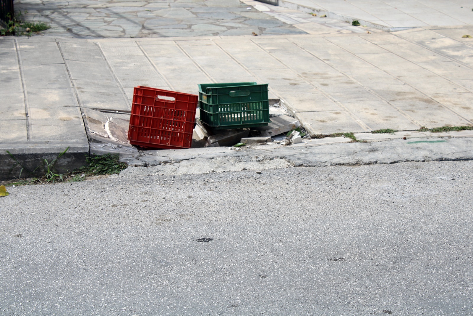 Λίγο ακριβώς πιο πέρα το πεζοδρόμιο έχει υποστεί καθίζηση και έχουν σπάσει κάποιες πλάκες. Δυστυχώς δεν είναι και το μοναδικό σημείο που έχει συμβεί αυτό.