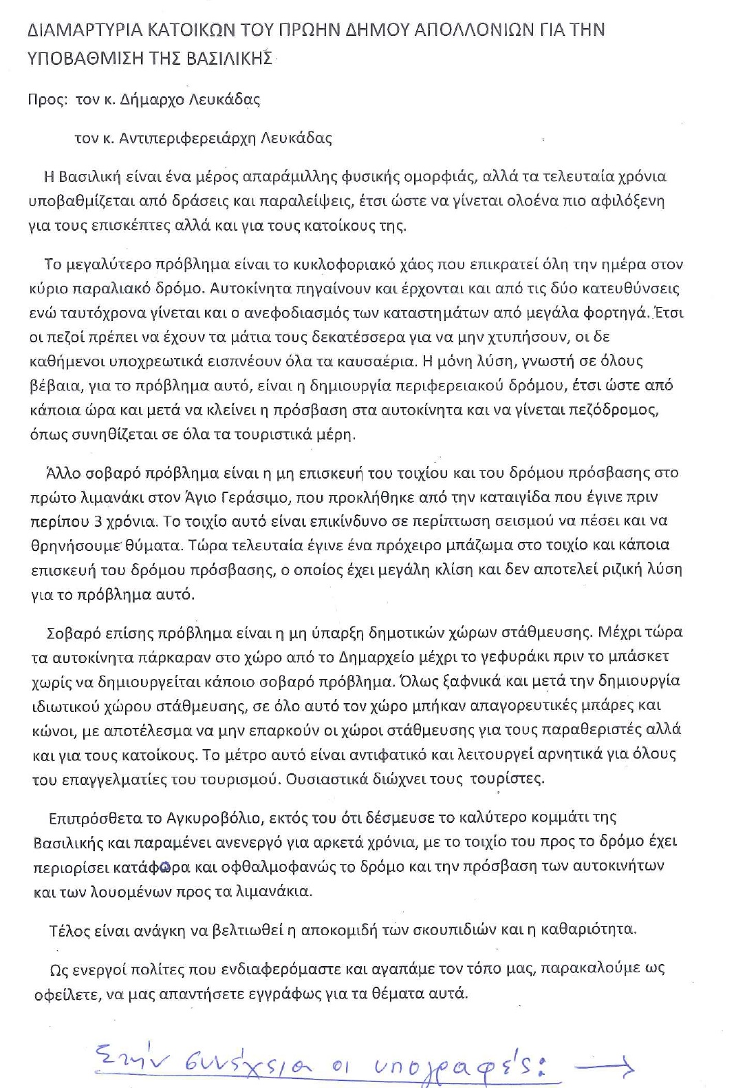 Με επιστολή τους προς τον Δήμαρχο και τον Αντιπεριφερειάρχη Λευκάδας 99 (ήταν αρχικά 105 αλλά οι έξι έχουν αποσύρει εντωμεταξύ τις υπογραφές τους) κάτοικοι του πρώην Δήμου Απολλωνίων που έχουν υπογράψει τη σχετική επιστολή, διαμαρτύρονται για την υποβάθμιση της Βασιλικής: