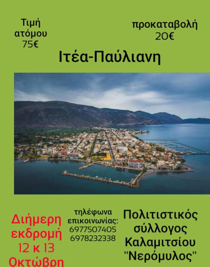 Διήμερη εκδρομή στην Ιτέα – Παύλιανη διοργανώνει στις 12 και 13 Οκτώβρη 2024 ο Πολιτιστικός Σύλλογος Καλαμιτσίου «Νερόμυλος».