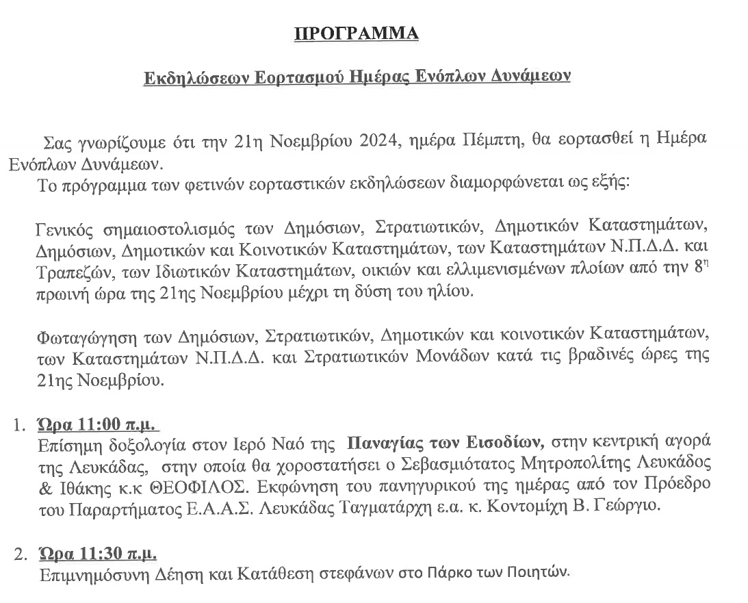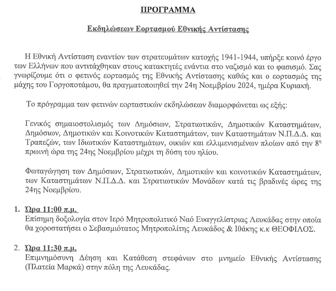 Το πρόγραμμα εορτασμού της Ημέρας των Ενόπλων Δυνάμεων, την Πέμπτη 21 Νοεμβρίου, και της Εθνικής Αντίστασης, την Κυριακή 24 Νοεμβρίου 2024, όπως ανακοινώνονται από την Περιφερειακή Ενότητα Λευκάδας.