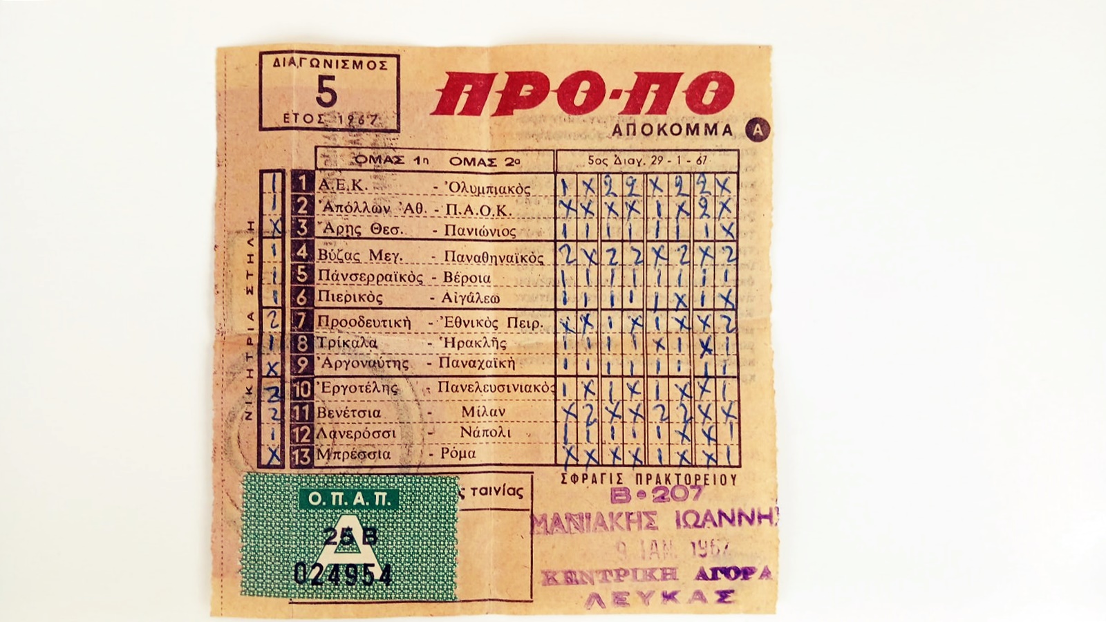 Το δελτίο ΠΡΟ-ΠΟ (Προγνωστικά Ποδοσφαίρου) είχε κατατεθεί στις 9 Ιανουαρίου 1967 στο Πρακτορείο του Ιωάννη Μανιάκη που βρισκόταν στην κεντρική Αγορά της πόλης της Λευκάδας. Δεν το θυμάμαι.