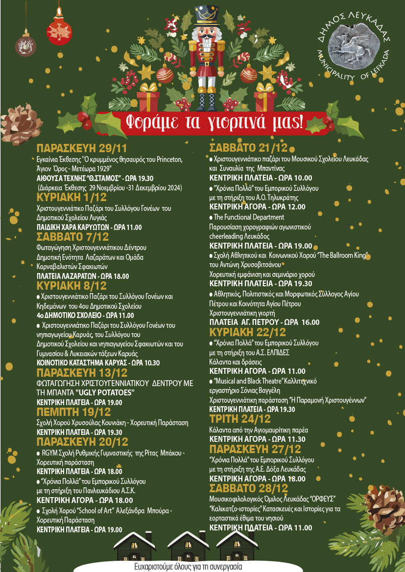 Δείτε παρακάτω το πρόγραμμα των Χριστουγεννιάτικων εκδηλώσεων του Δήμου Λευκάδας.