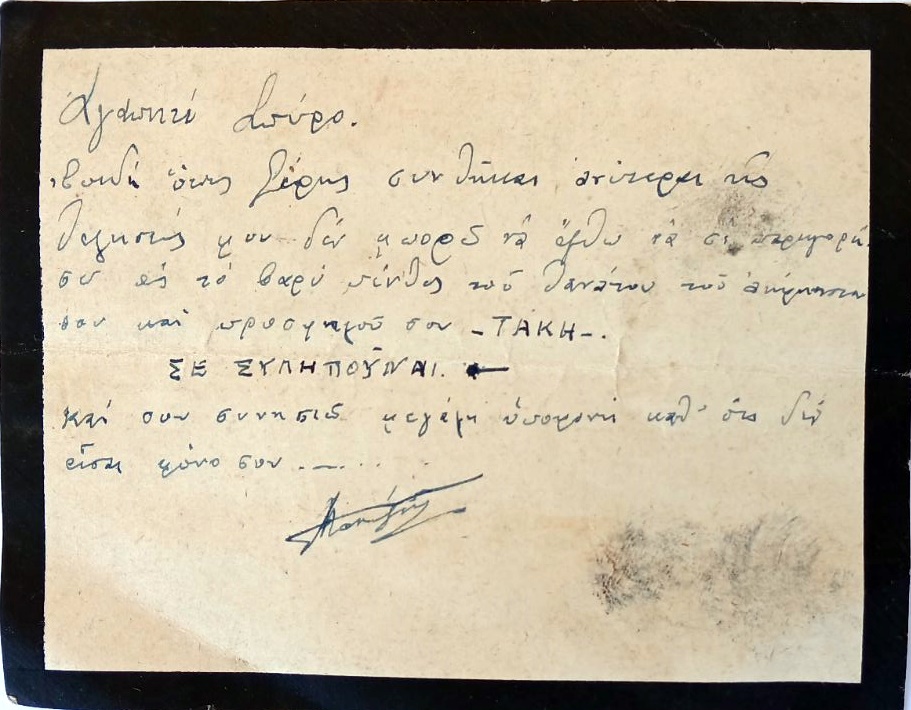 Επειδή όπως ξέρης συνθήκες ανωτέρας της θελήσεώς μου δεν μπορώ να έρθω να σε παρηγορήσω στο βαρύ πένθος του θανάτου του αείμνηστού (;) σου και προσφιλού σου ΤΑΚΗ ΣΕ ΣΥΛΗΠΟΥΜΑΙ και σου συνιστώ μεγάλη υπομονή καθ΄ ότι δεν είσαι μόνος σου.