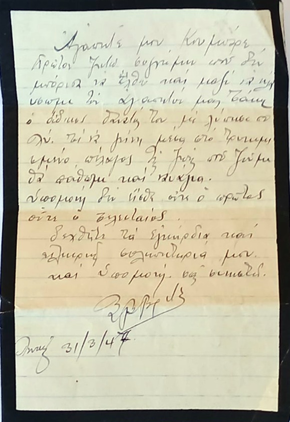 πρώτον ζητώ συγνώμη που δεν μπόρεσα να έλθω και μαζί να κλαύσωμε τον αγαπητό μας Τάκη. Ο άδικος θάνατός του με λύπησε πολύ. Τι να γίνη μέσα στο τρικυμισμένο πέλαγος της ζωής που ζούμε θα πάθωμε και ναυάγια.