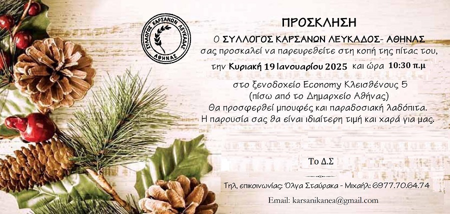 Ο Σύλλογος Καρσάνων Λευκάδας-Αθήνας προσκαλεί στην κοπή της Πρωτοχρονιάτικης πίτας του που θα πραγματοποιηθεί την Κυριακή 19 Ιανουαρίου 2025, στις 10:30 π.μ., στο ξενοδοχείο Economy (Κλεισθένους 5, πίσω από το Δημαρχείο Αθήνας).