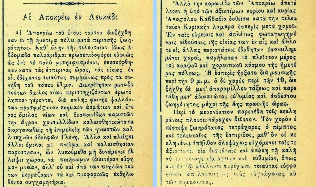 «Αι Αποκρέω του έτους τούτου διεξήχθησαν εν τη ημετέρα πόλει μετά περισσής ζωηρότητος. Καθ΄ όλην την τελευταίαν ιδίως εβδομάδα πολυάριθμοι προσωπιδοφόροι ευφυώς ως επί το πολύ μετημφιεσμένοι, επεσκέφθησαν κατά τας εσπερινάς ώρας, τας οικίας εν αις εδέχοντο τοιαύτας συμφώνως προς τα συνήθη του τόπου έθιμα.