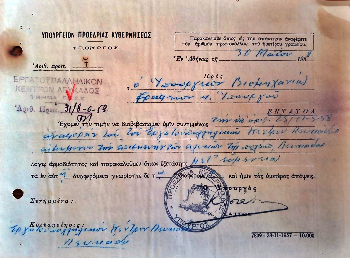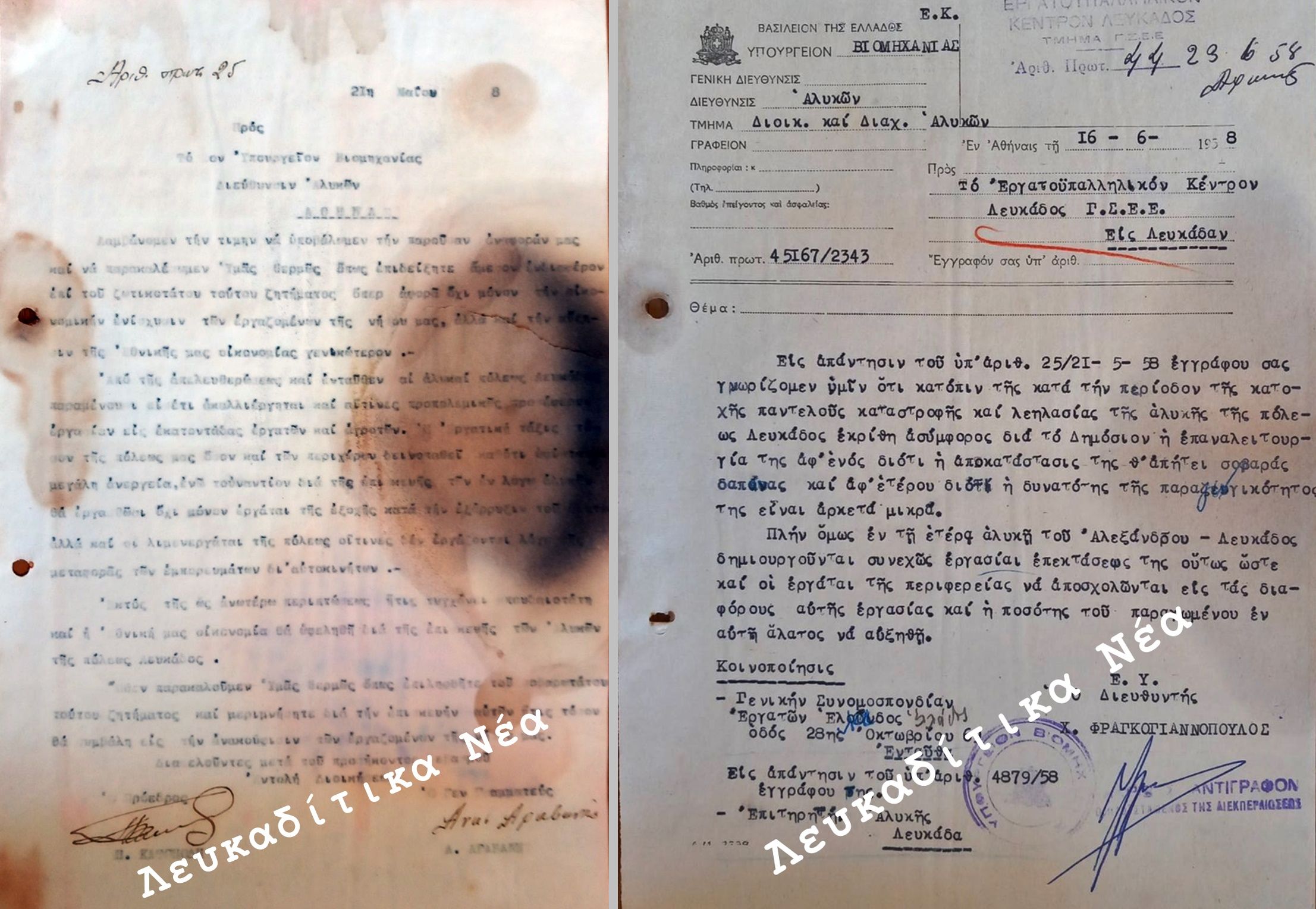 Η αρμόδια Διεύθυνση Αλυκών του Τμήματος Διοίκησης και Διαχείρισης Αλυκών του Υπουργείου Βιομηχανίας θα απαντήσει τον Ιούνιο του 1958 ως εξής στο αίτημα της Διοίκησης του Εργατοϋπαλληλικού Κέντρου Λευκάδας: