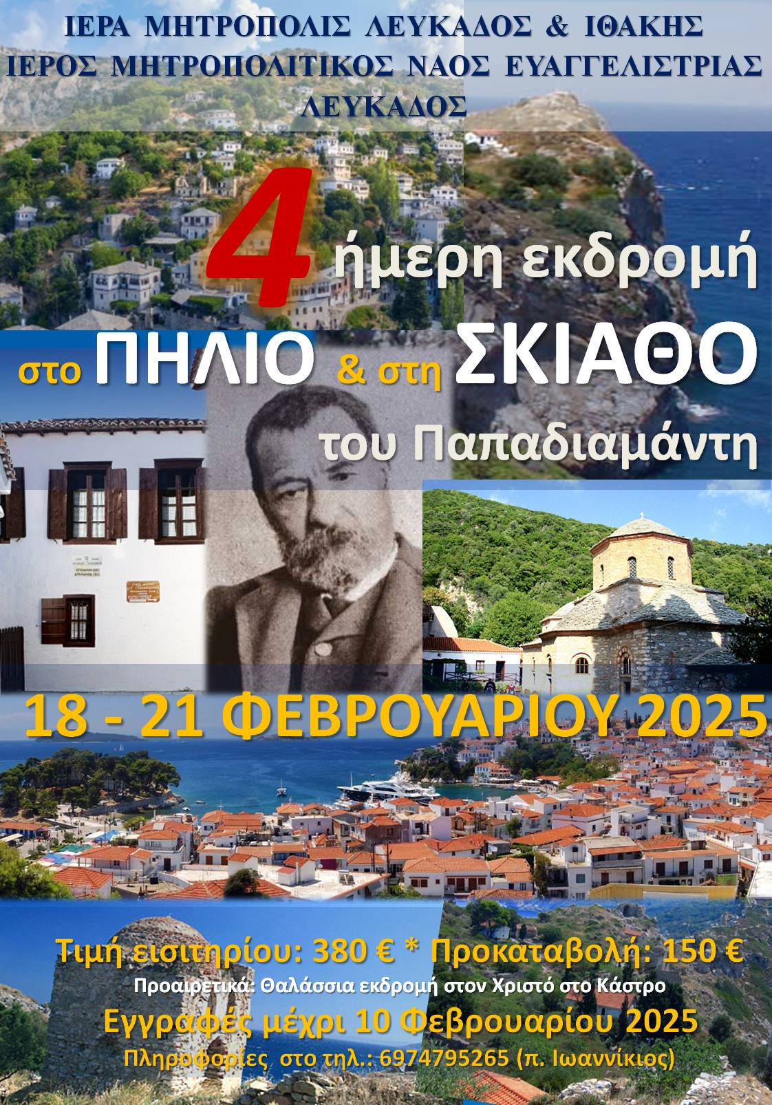 Γίνεται γνωστό ότι, με την ευλογία του Σεβασμιωτάτου Ποιμενάρχου μας κ. Θεοφίλου, η Ενορία Ευαγγελιστρίας (Μητροπόλεως) Λευκάδος προγραμματίζει τετραήμερη εκδρομή στο ΠΗΛΙΟ και στον ΒΟΛΟ και κυρίως στη ΣΚΙΑΘΟ, το νησί του Αλέξανδρου Παπαδιαμάντη, το μεγαλύτερο νησί των Σποράδων.