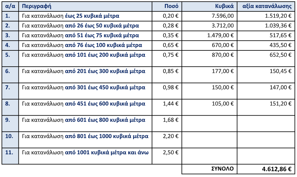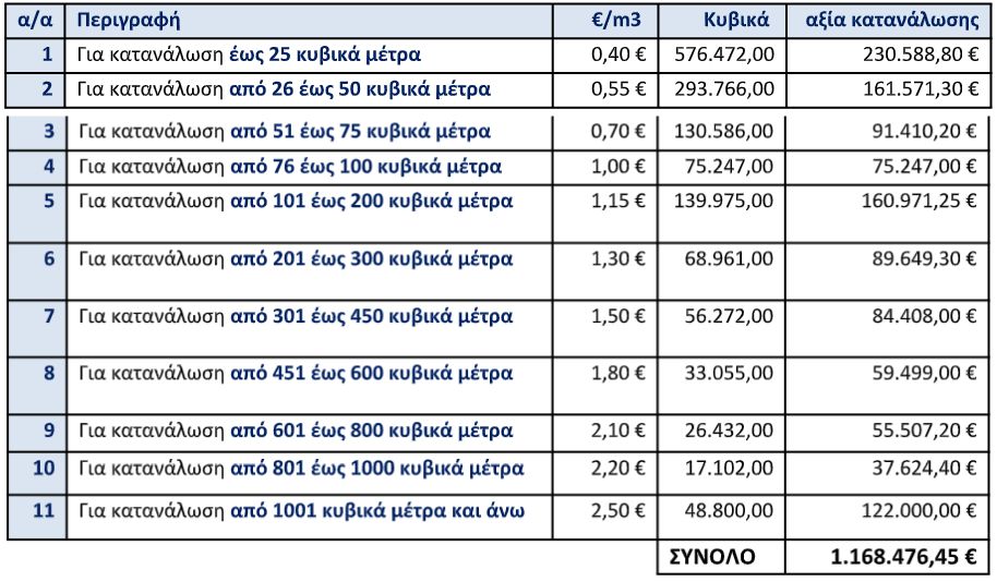 Συγκεκριμένα η δημοτική αρχή προτείνει την αναπροσαρμογή του τέλους και των δικαιωμάτων ύδρευσης – άρδευσης – αποχέτευσης για το έτος 2025, η οποία θα συνεχίσει να γίνεται με κλιμακωτή χρέωση ανάλογα με την κατανάλωση νερού, ενώ ισχύουν διαφορετικές τιμές στο κυβικό μέτρο ανά περιοχή και δραστηριότητα.